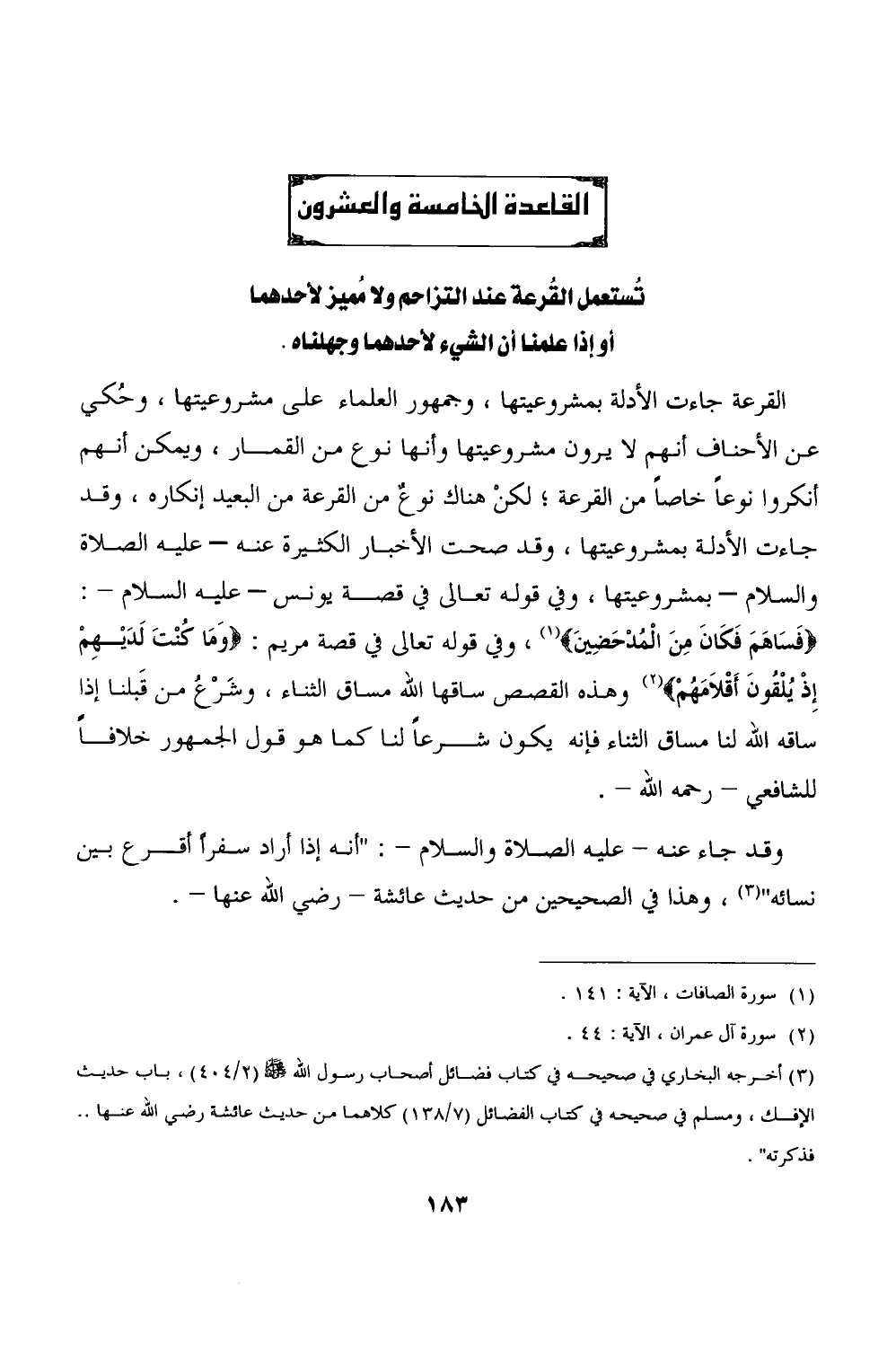القرعة جاءت الأدلة بمشروعيتها، وجمهور العلماء على مشروعيتها، وحُكي عن الأحناف أنهم لا يرون مشروعيتها وأنها نوع من القمار، ويمكن أنهم أنكروا نوعاً خاصاً من القرعة؛ لكنْ هناك نوعٌ من القرعة من البعيد إنكاره، وقد جاءت الأدلة بمشروعيتها، وقد صحت الأخبار الكثيرة عنه - عليه الصلاة والسلام - بمشروعيتها، وفي قوله تعالى في قصة يونس - عليه السلام -: {فَسَاهَمَ فَكَانَ مِنَ الْمُدْحَضِينَ} (١)، وفي قوله تعالى في قصة مريم: {وَمَا كُنْتَ لَدَيْهِمْ إِذْ يُلْقُونَ أَقْلَامَهُمْ} (٢) وهذه القصص ساقها الله مساق الثناء، وشَرْعُ من قَبلنا إذا ساقه الله لنا مساق الثناء فإنه يكون شرعًا لنا كما هو قول الجمهور خلافاً للشافعى - رحمه الله -.