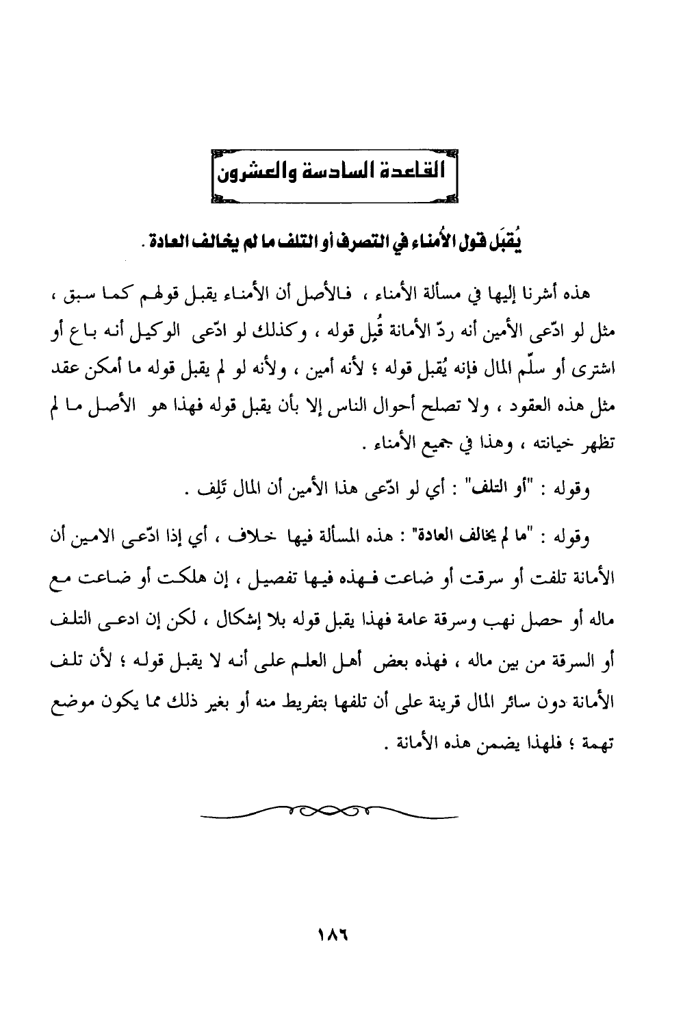 القاعدة السادسة والعشرون يُقبَل قول الأُمناء فى التصرف أو التلف ما لم يخالف العادة
