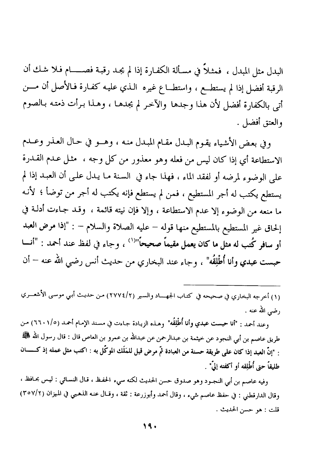 وفي بعض الأشياء يقوم البدل مقام المبدل منه، وهو في حال العذر وعدم الاستطاعة أي إذا كان ليس من فعله وهو معذور من كل وجه، مثل عدم القدرة على الوضوء لمرضه أو لفقد الماء، فهذا جاء في السنة ما يدل على أن العبد إذا لم يستطع يكتب له أجر المستطيع، فمن لم يستطع فإنه يكتب له أجر من توضأ؛ لأنه ما منعه من الوضوء إلا عدم الاستطاعة، وإلا فإن نيته قائمة، وقد جاءت أدلة في إلحاق غير المستطيع بالمستطيع منها قوله - عليه الصلاة والسلام -: "إذا مرض العبد أو سافر كُتب له مثل ما كان يعمل مقيماً صحيحاً" (١)، وجاء في لفظ عند أحمد: "أنا حبست عبدي وأنا أُطْلِقُه"، وجاء عند البخاري من حديث أنس رضى الله عنه - أن