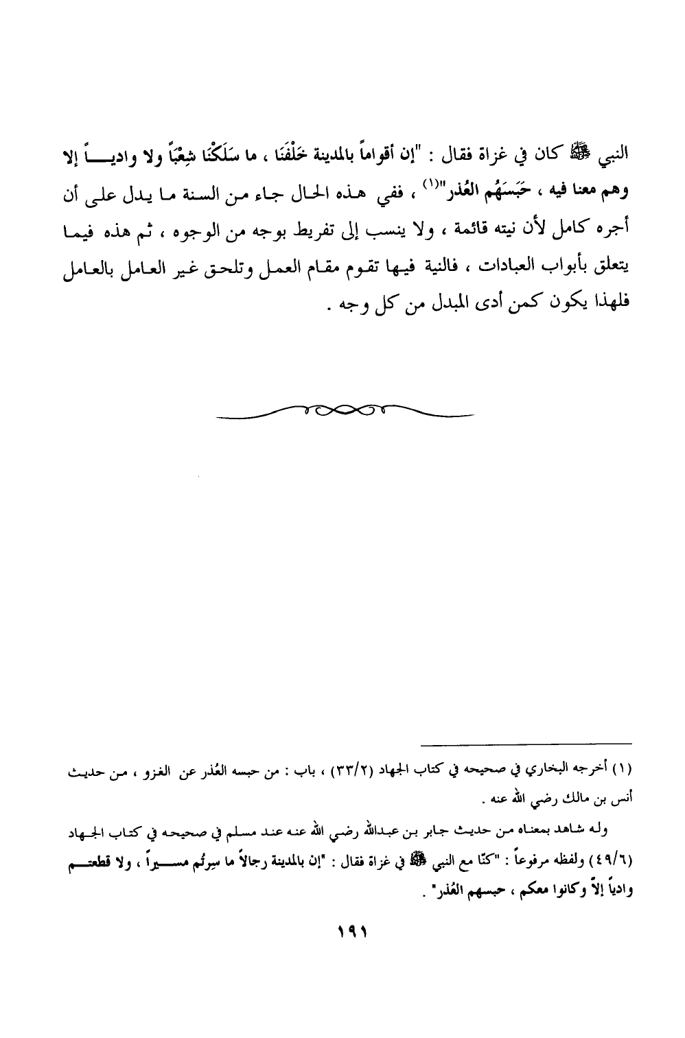 (١) أخرجه البخارى في صحيحه في كتاب الجهاد (٢/ ٣٣)، باب: من حبسه العُذر عن الغزو، من حديث أنس بن مالك رضى الله عنه.