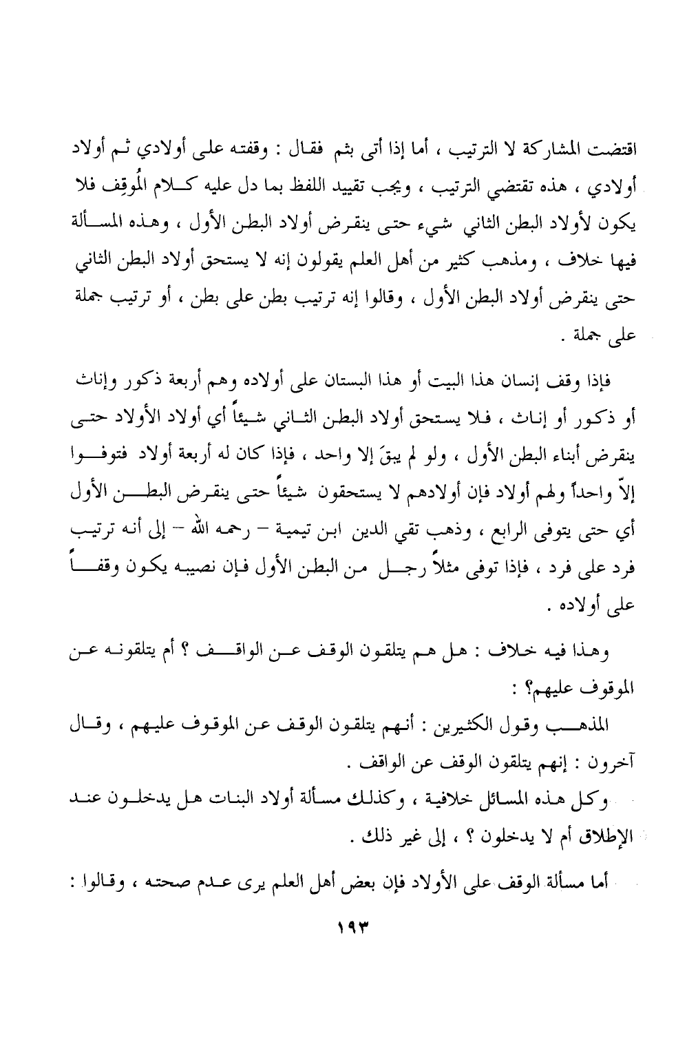 فإذا وقف إنسان هذا البيت أو هذا البستان على أولاده وهم أربعة ذكور وإناث أو ذكور أو إناث، فلا يستحق أولاد البطن الثانى شيئاً أي أولاد الأولاد حتى ينقرض أبناء البطن الأول، ولو لم يبقَ إلا واحد، فإذا كان له أربعة أولاد فتوفوا إلاّ واحداً ولهم أولاد فإن أولادهم لا يستحقون شيئًا حتى ينقرض البطن الأول أي حتى يتوفى الرابع، وذهب تقي الدين ابن تيمية - رحمه الله - إلى أنه ترتيب فرد على فرد، فإذا توفى مثلا رجل من البطن الأول فإن نصيبه يكون وقفا على أولاده.