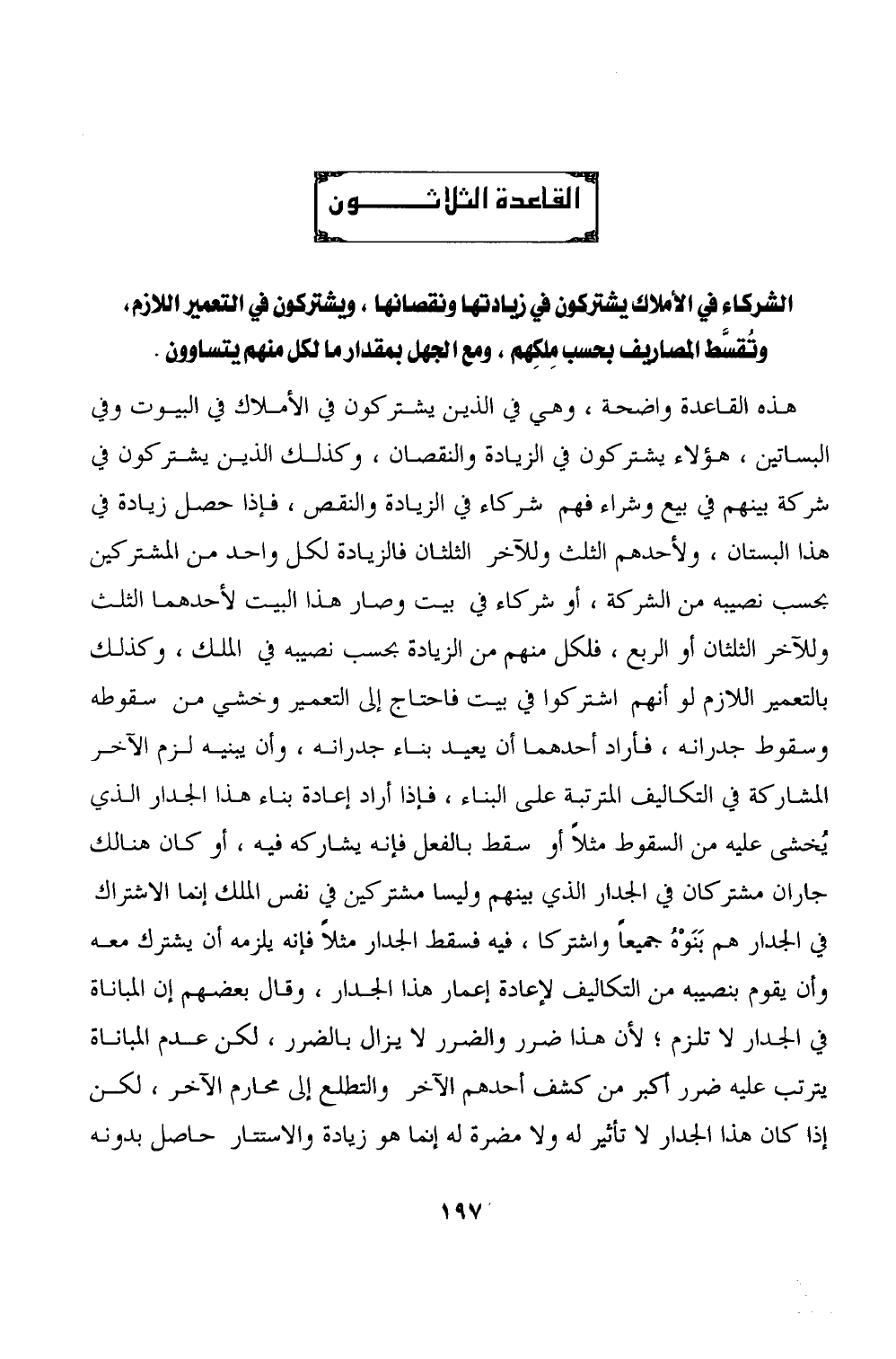 القاعدة الثلاثون الشركاء في الأملاك يشتركون في زيادتها ونقصانها، ويشتركون في التعمير اللازم، وتُقسَّط المصاريف بحسب مِلكِهم، ومع الجهل بمقدار ما لكل منهم يتساوون