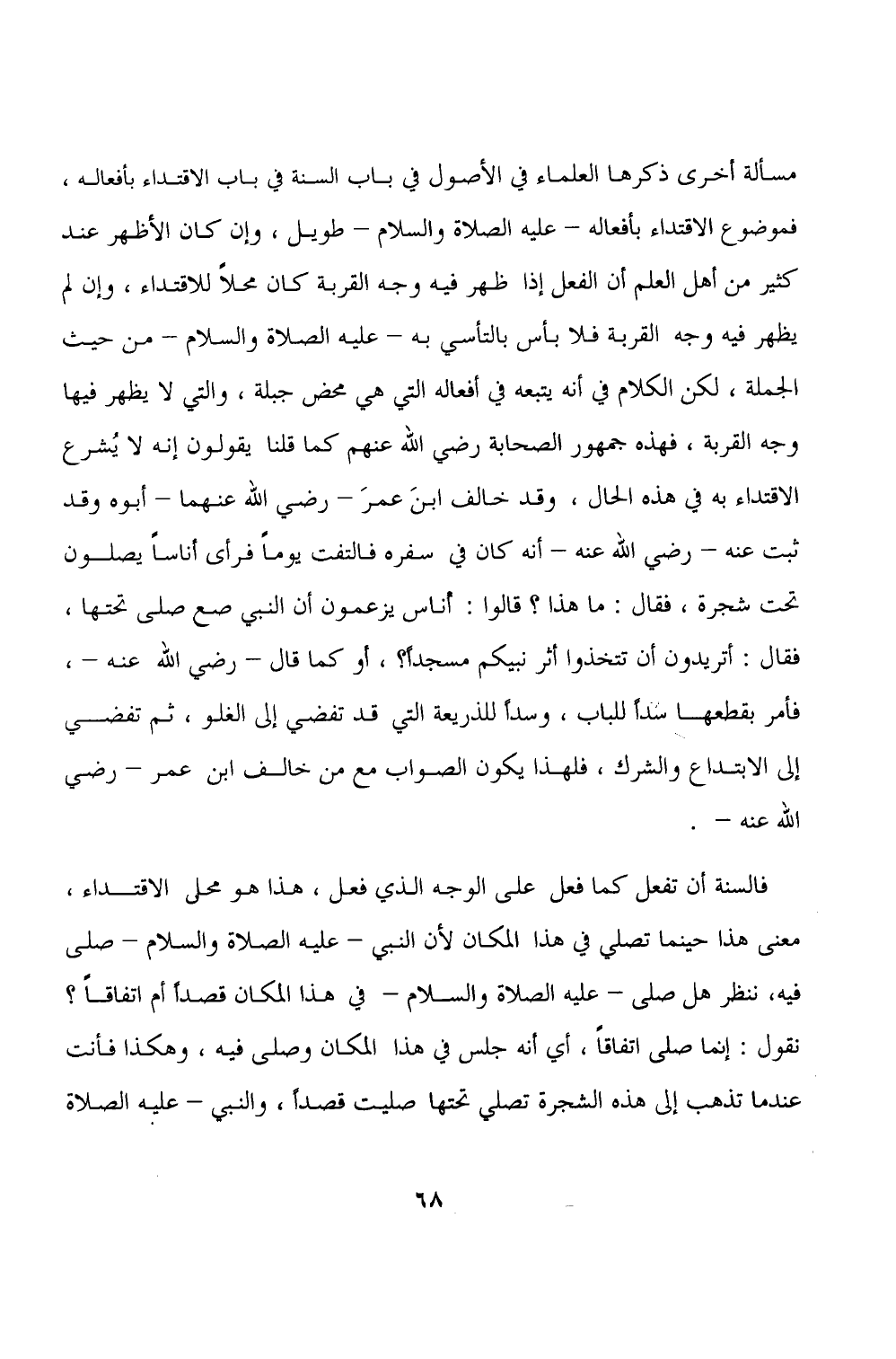 مسألة أخرى ذكرها العلماء في الأصول في باب السنة في باب الاقتداء بأفعاله، فموضوع الاقتداء بأفعاله - عليه الصلاة والسلام - طويل، وإن كان الأظهر عند كثير من أهل العلم أن الفعل إذا ظهر فيه وجه القربة كان محلًا للاقتداء، وإن لم يظهر فيه وجه القربة فلا بأس بالتأسى به - عليه الصلاة والسلام - من حيث الجملة، لكن الكلام في أنه يتبعه في أفعاله التي هي محض جبلة، والتي لا يظهر فيها وجه القربة، فهذه جمهور الصحابة رضي الله عنهم كما قلنا يقولون إنه لا يُشرع الاقتداء به في هذه الحال، وقد خالف ابنَ عمرَ - رضي الله عنهما - أبوه وقد ثبت عنه - رضي الله عنه - أنه كان في سفره فالتفت يومًا فرأى أناسًا يصلون تحت شجرة، فقال: ما هذا؟ قالوا: أناس يزعمون أن النبي - صلى الله عليه وسلم - صلى تحتها، فقال: أتريدون أن تتخذوا أثر نبيكم مسجدًا؟، أو كما قال - رضي الله عنه -، فأمر بقطعها سندًا للباب، وسدًا للذريعة التي قد تفضي إلى الغلو، ثم تفضي إلى الابتداع والشرك، فلهذا يكون الصواب مع من خالف ابن عمر - رضي الله عنه -.