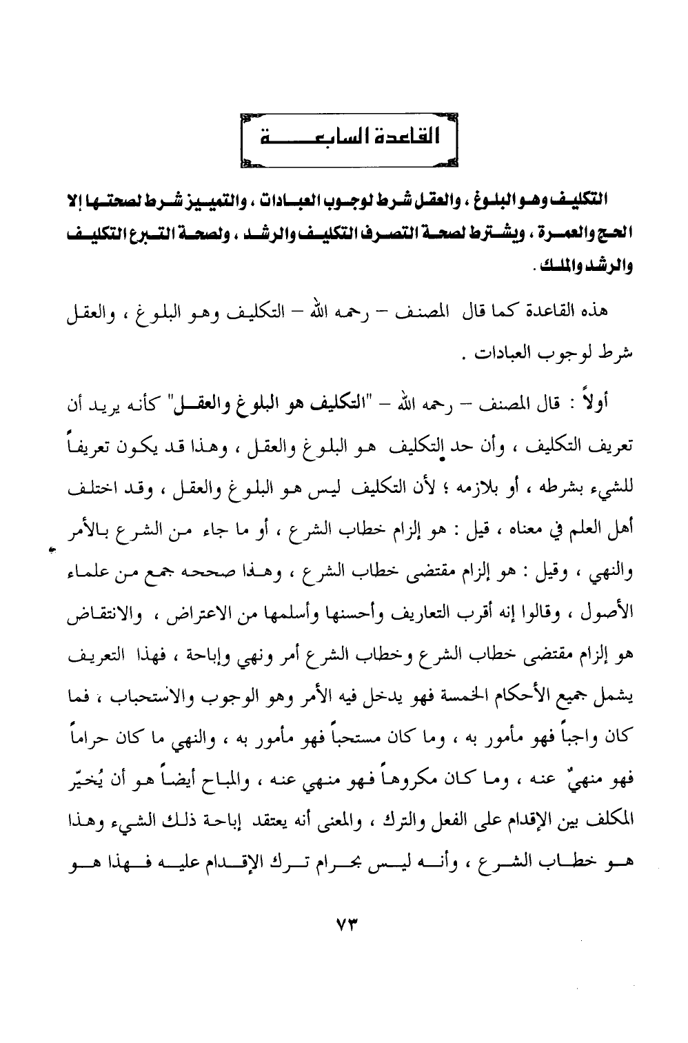 القاعدة السابعة التكليف وهو البلوغ، والعقل شرط لوجوب العبادات، والتمييز شرط لصحتها إلا الحج والعمرة، ويشترط لصحة التصرف التكليف والرشد، ولصحة التبرع التكليف والرشد والملك