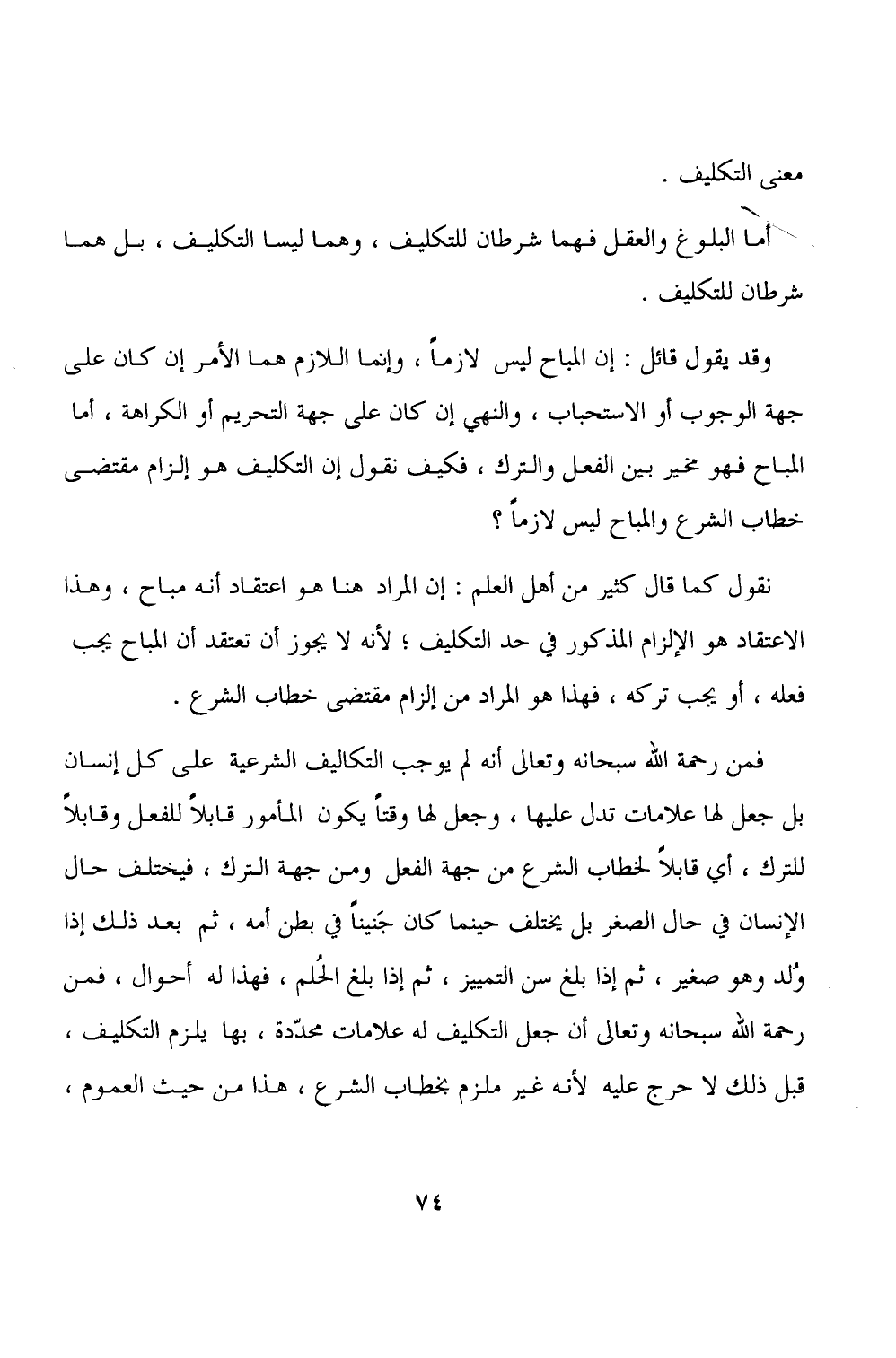 فمن رحمة الله سبحانه وتعالى أنه لم يوجب التكاليف الشرعية على كل إنسان بل جعل لها علامات تدل عليها، وجعل لها وقتًا يكون المأمور قابلًا للفعل وقابلًا للترك، أي قابلًا لخطاب الشرع من جهة الفعل ومن جهة الترك، فيختلف حال الإنسان في حال الصغر بل يختلف حينما كان جَنينًا في بطن أمه، ثم بعد ذلك إذا وُلد وهو صغير، ثم إذا بلغ سن التمييز، ثم إذا بلغ الحُلم، فهذا له أحوال، فمن رحمة الله سبحانه وتعالى أن جعل التكليف له علامات محدّدة، بها يلزم التكليف، قبل ذلك لا حرج عليه لأنه غير ملزم بخطاب الشرع، هذا من حيث العموم،