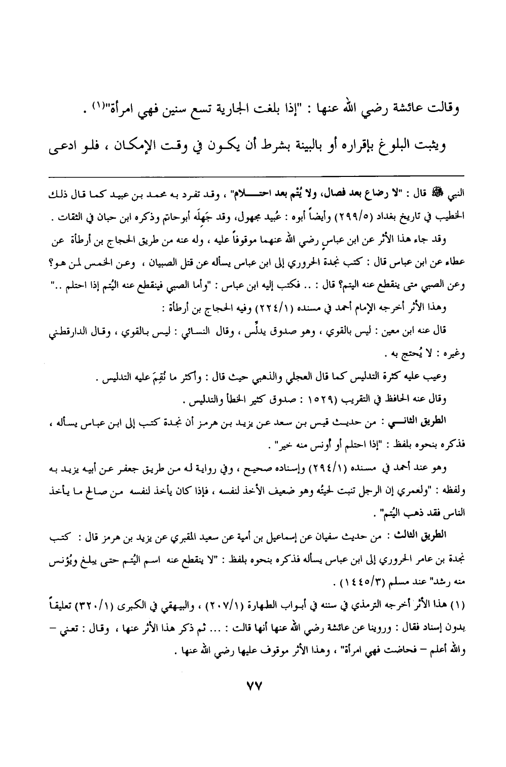 وقالت عائشة رضي الله عنها: "إذا بلغت الجارية تسع سنين فهي امرأة" (١).