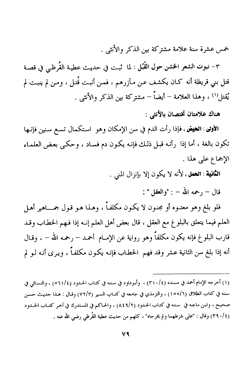 ٣ - نبوت الشعر الحسين حول القُبُل: لما ثبت في حديث عطة القُرظي في قصة قتل بني قريظة أنه كان يكشف عن مآزرهم، فمن أثبت قُتل، ومن لم ينبت لم يُقتل (١)، وهذا العلامة - أيضًا - مشتركة بين الذكر والأنثى.