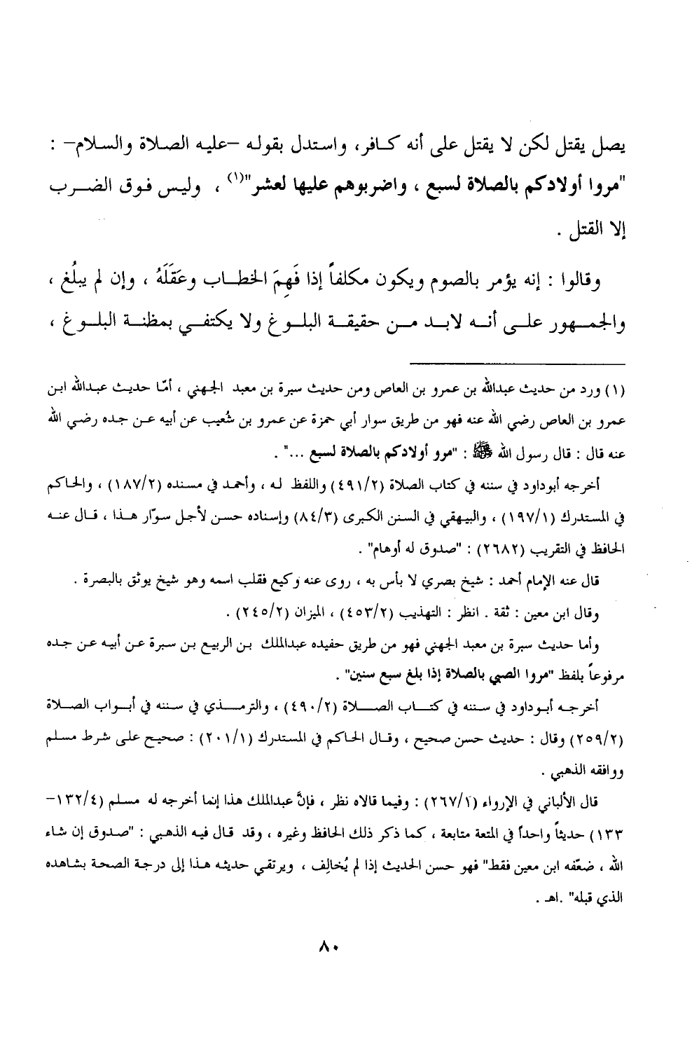 وأما حديث سبرة بن معبد الجهني فهو من طريق حفيده عبد الملك بن الربيع بن سبرة عن أبيه عن جده مرفوعًا بلفظ "مروا الصبى بالصلاة إذا بلغ سبع سنين".