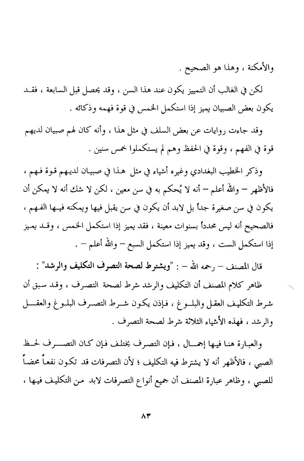 قال المصنف - رحمه الله -: "ويشترط لصحة التصرف التكليف والرشد":