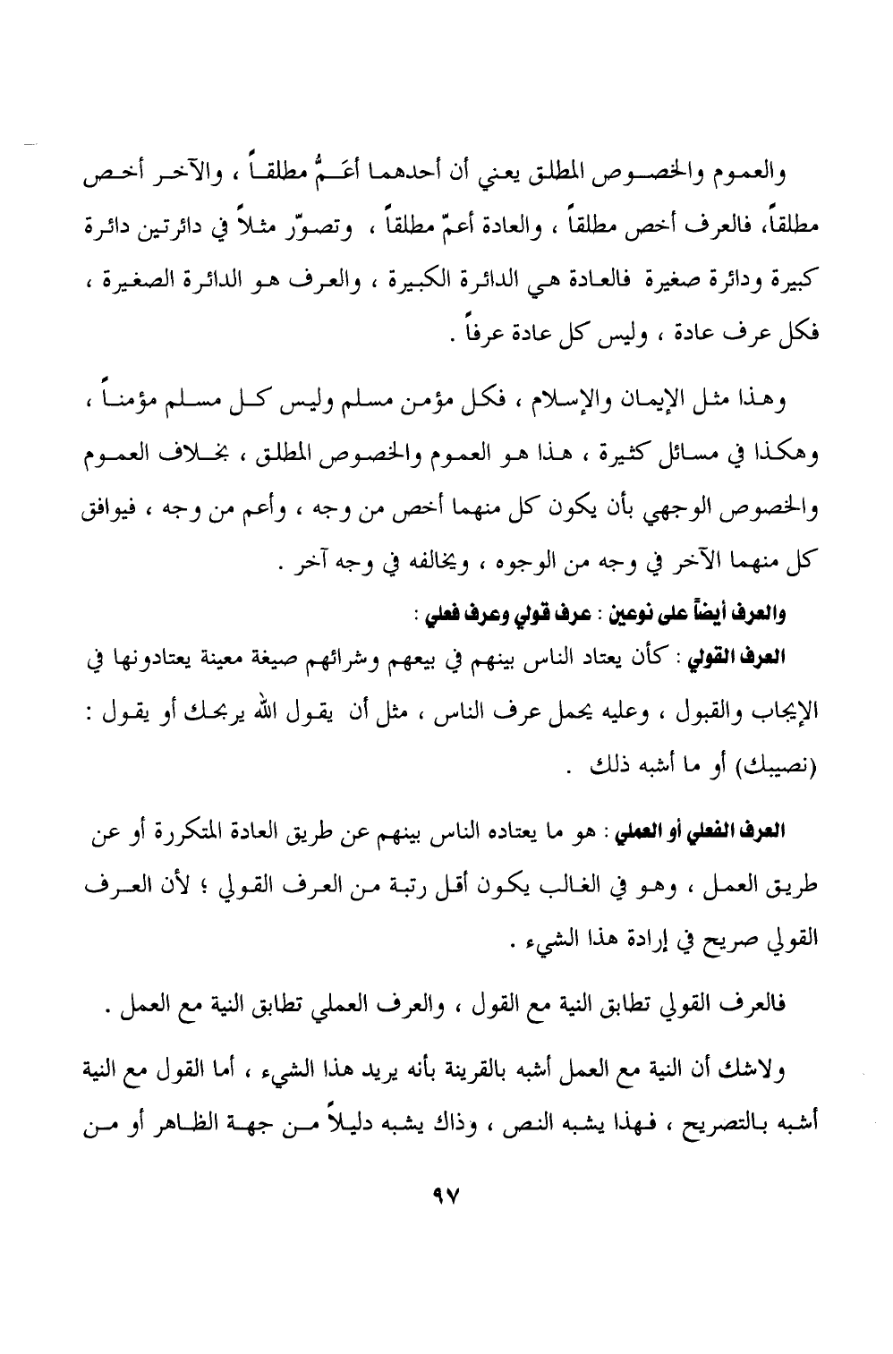 والعموم والخصوص المطلق يعني أن أحدهما أعَمُّ مطلقًا، والآخر أخص مطلقًا، فالعرف أخص مطلقًا، والعادة أعمّ مطلقًا، وتصوّر مثلًا في دائرتين دائرة كبيرة ودائرة صغيرة فالعادة هي الدائرة الكبيرة، والعرف هو الدائرة الصغيرة، فكل عرف عادة، وليس كل عادة عرفًا.