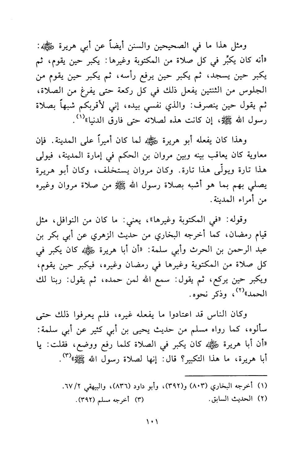 وَكَانَ النَّاسُ قَدِ اعْتَادُوا مَا يَفْعَلُهُ غَيْرُهُ فَلَمْ يَعْرِفُوا ذَلِكَ حَتَّى سَأَلُوهُ، كَمَا رَوَاهُ مسلم مِنْ حَدِيثِ يَحْيَى بْنِ أَبِي كَثِيرٍ عَنْ أبي سلمة: " «أَنَّ أَبَا هُرَيْرَةَ رَضِيَ اللَّهُ عَنْهُ كَانَ يُكَبِّرُ فِي الصَّلَاةِ كُلَّمَا رَفَعَ وَوَضَعَ، فَقُلْتُ: يَا أَبَا هُرَيْرَةَ مَا هَذَا التَّكْبِيرُ؟ قَالَ: إِنَّهَا لَصَلَاةُ رَسُولِ اللَّهِ صَلَّى اللَّهُ عَلَيْهِ وَسَلَّمَ» ".