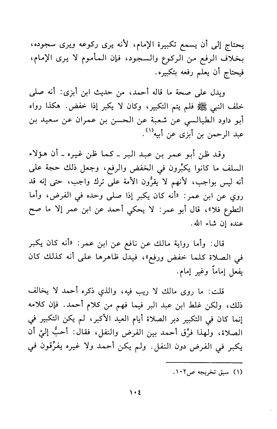 قَالَ: وَأَمَّا رِوَايَةُ مالك عَنْ نافع عَنِ ابْنِ عُمَرَ " أَنَّهُ كَانَ يُكَبِّرُ فِي الصَّلَاةِ كُلَّمَا خَفَضَ وَرَفَعَ " فَيَدُلُّ ظَاهِرُهَا عَلَى أَنَّهُ كَذَلِكَ كَانَ يَفْعَلُ، إِمَامًا وَغَيْرَ إِمَامٍ، قُلْتُ: مَا رَوَى مالك لَا رَيْبَ فِيهِ، وَالَّذِي ذَكَرَهُ أحمد لَا يُخَالِفُ ذَلِكَ وَلَكِنْ غَلِطَ ابْنُ عَبْدِ الْبَرِّ فِيمَا فَهِمَ مِنْ كَلَامِ أحمد؛ فَإِنَّ كَلَامَهُ إِنَّمَا كَانَ فِي التَّكْبِيرِ دُبُرَ الصَّلَاةِ أَيَّامَ الْعِيدِ الْأَكْبَرِ، لَمْ يَكُنِ التَّكْبِيرُ فِي الصَّلَاةِ؛ وَلِهَذَا فَرَّقَ أحمد بَيْنَ الْفَرْضِ وَالنَّفْلِ، فَقَالَ: " أَحَبُّ إِلَيَّ أَنْ يُكَبِّرَ فِي الْفَرْضِ دُونَ النَّفْلِ " وَلَمْ يَكُنْ أحمد وَلَا غَيْرُهُ يُفَرِّقُونَ فِي