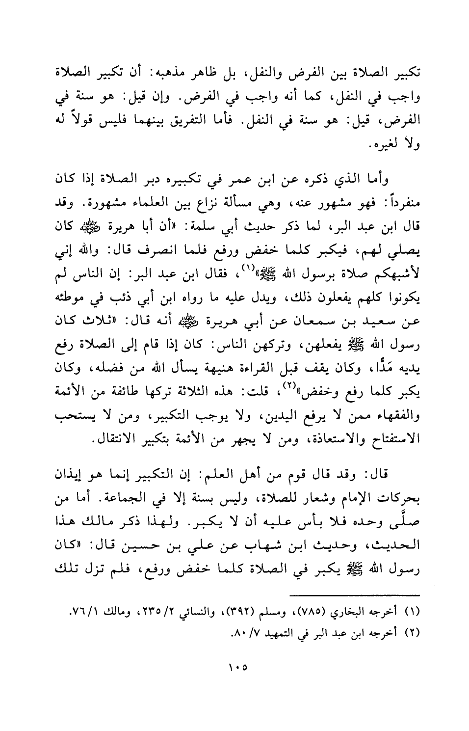 وَأَمَّا الَّذِي ذَكَرَهُ عَنِ ابْنِ عُمَرَ فِي تَكْبِيرِهِ دُبُرَ الصَّلَاةِ إِذَا كَانَ مُنْفَرِدًا فَهُو مَشْهُورٌ عَنْهُ، وَهِيَ مَسْأَلَةُ نِزَاعٍ بَيْنَ الْعُلَمَاءِ مَشْهُورَةٌ، وَقَدْ قَالَ ابْنُ عَبْدِ الْبَرِّ لَمَّا ذَكَرَ حَدِيثَ أبي سلمة: " «أَنَّ أَبَا هُرَيْرَةَ رَضِيَ اللَّهُ عَنْهُ كَانَ يُصَلِّي لَهُمْ فَيُكَبِّرُ كُلَّمَا خَفَضَ وَرَفَعَ، فَلَمَّا انْصَرَفَ قَالَ: وَاللَّهِ إِنِّي لَأَشْبَهُكُمْ صَلَاةً بِرَسُولِ اللَّهِ صَلَّى اللَّهُ عَلَيْهِ وَسَلَّمَ» " فَقَالَ ابْنُ عَبْدِ الْبَرِّ: إِنَّ النَّاسَ لَمْ يَكُونُوا كُلُّهُمْ يَفْعَلُونَ ذَلِكَ، وَيَدُلُّ عَلَيْهِ مَا رَوَاهُ ابْنُ أَبِي ذِئْبٍ فِي مُوَطَّئِهِ عَنْ سعيد بن سمعان عَنْ أَبِي هُرَيْرَةَ رَضِيَ اللَّهُ عَنْهُ أَنَّهُ قَالَ: " «ثَلَاثٌ كَانَ رَسُولُ اللَّهِ صَلَّى اللَّهُ عَلَيْهِ وَسَلَّمَ يَفْعَلُهُنَّ وَتَرَكَهُنَّ النَّاسُ: كَانَ إِذَا قَامَ إِلَى الصَّلَاةِ رَفَعَ يَدَيْهِ مَدًّا، وَكَانَ يَقِفُ قَبْلَ الْقِرَاءَةِ هُنَيْهَةً يَسْأَلُ اللَّهَ مِنْ فَضْلِهِ، وَكَانَ يُكَبِّرُ كُلَّمَا رَفَعَ وَخَفَضَ» " قُلْتُ: هَذِهِ الثَّلَاثَةُ تَرَكَهَا طَائِفَةٌ مِنَ الْأَئِمَّةِ وَالْفُقَهَاءِ مِمَّنْ لَا يَرْفَعُ الْيَدَيْنِ وَلَا يُوجِبُ التَّكْبِيرَ وَمَنْ لَا يَسْتَحِبُّ الِاسْتِفْتَاحَ وَالِاسْتِعَاذَةَ، وَمَنْ لَا يَجْهَرُ مِنَ الْأَئِمَّةِ بِتَكْبِيرِ الِانْتِقَالِ.