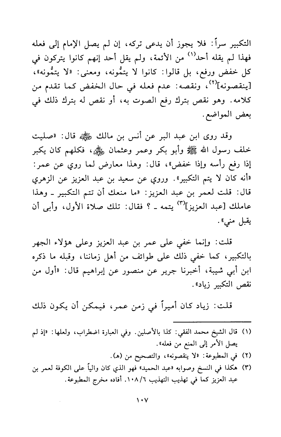 التَّكْبِيرَ سِرًّا فَلَا يَجُوزُ أَنْ يُدَّعَى تَرْكُهُ إِنْ لَمْ يَصِلِ الْإِمَامُ إِلَى فِعْلِهِ، فَهَذَا لَمْ يَقُلْهُ أَحَدٌ مِنَ الْأَئِمَّةِ وَلَمْ يَقُلْ أَحَدٌ: إِنَّهُمْ كَانُوا يَتْرُكُونَ فِي كُلِّ خَفْضٍ وَرَفْعٍ، بَلْ قَالُوا: كَانُوا لَا يُتِمُّونَهُ، " وَمَعْنَى لَا يُتِمُّونَهُ " [يُنْقِصُونَهُ] وَنَقْصُهُ عَدَمُ فِعْلِهِ فِي حَالِ الْخَفْضِ، كَمَا تَقَدَّمَ مِنْ كَلَامِهِ، وَهُوَ نَقْصٌ بِتَرْكِ رَفْعِ الصَّوْتِ بِهِ، أَوْ نَقْصٌ لَهُ بِتَرْكِ ذَلِكَ فِي بَعْضِ الْمَوَاضِعِ.