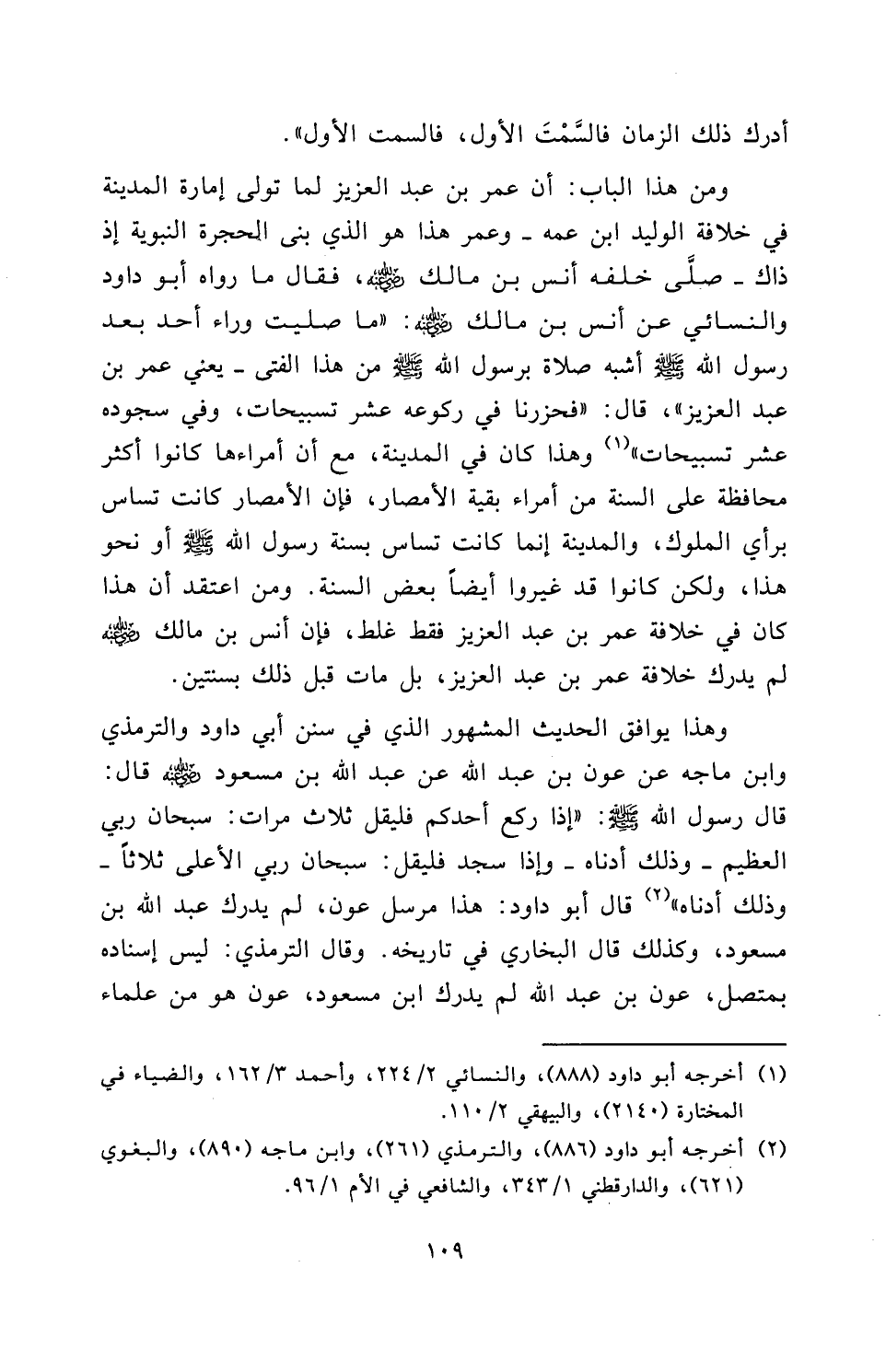وَمِنْ هَذَا الْبَابِ أَنَّ عمر بن عبد العزيز لَمَّا تَوَلَّى إِمَارَةَ الْمَدِينَةِ فِي خِلَافَةِ الوليد ابْنِ عَمِّهِ - وعمر هَذَا هُوَ الَّذِي بَنَى الْحُجْرَةَ النَّبَوِيَّةَ إِذْ ذَاكَ - صَلَّى خَلْفَهُ أَنَسُ بْنُ مَالِكٍ رَضِيَ اللَّهُ عَنْهُ، فَقَالَ مَا رَوَاهُ أبو داود وَالنَّسَائِيُّ عَنْ أَنَسِ بْنِ مَالِكٍ رَضِيَ اللَّهُ عَنْهُ: " «مَا صَلَّيْتُ وَرَاءَ أَحَدٍ بَعْدَ رَسُولٍ صَلَّى اللَّهُ عَلَيْهِ وَسَلَّمَ أَشْبَهَ صَلَاةً بِرَسُولِ اللَّهِ صَلَّى اللَّهُ عَلَيْهِ وَسَلَّمَ مِنْ هَذَا الْفَتَى " يَعْنِي: عُمَرَ بْنَ عَبْدِ الْعَزِيزِ، قَالَ: " فَحَزَرْنَا فِي رُكُوعِهِ عَشْرَ تَسْبِيحَاتٍ، وَفِي سُجُودِهِ عَشْرَ تَسْبِيحَاتٍ» " وَهَذَا كَانَ فِي الْمَدِينَةِ، مَعَ أَنَّ أُمَرَاءَهَا كَانُوا أَكْثَرَ مُحَافَظَةً عَلَى السُّنَّةِ مِنْ أُمَرَاءِ بَقِيَّةِ الْأَمْصَارِ، فَإِنَّ الْأَمْصَارَ كَانَتْ تُسَاسُ بِرَأْيِ الْمُلُوكِ، وَالْمَدِينَةُ إِنَّمَا كَانَتْ تُسَاسُ بِسُنَّةِ رَسُولِ اللَّهِ صَلَّى اللَّهُ عَلَيْهِ وَسَلَّمَ أَوْ نَحْوِ هَذَا، وَلَكِنْ كَانُوا قَدْ غَيَّرُوا أَيْضًا بَعْضَ السُّنَّةِ، وَمَنِ اعْتَقَدَ أَنَّ هَذَا كَانَ فِي خِلَافَةِ عُمَرَ بْنِ عَبْدِ الْعَزِيزِ فَقَدْ غَلِطَ، فَإِنَّ أَنَسَ بْنَ مَالِكٍ رَضِيَ اللَّهُ عَنْهُ لَمْ يُدْرِكْ خِلَافَةَ عُمَرَ بْنِ عَبْدِ الْعَزِيزِ، بَلْ مَاتَ قَبْلَ ذَلِكَ بِسَنَتَيْنِ.