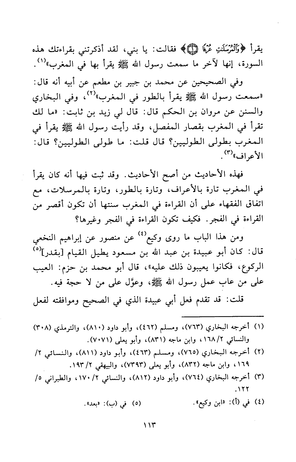 فَهَذِهِ الْأَحَادِيثُ مِنْ أَصَحِّ الْأَحَادِيثِ، وَقَدْ ثَبَتَ فِيهَا أَنَّهُ كَانَ يَقْرَأُ فِي الْمَغْرِبِ تَارَةً بِالْأَعْرَافِ وَتَارَةً بِالطُّورِ وَتَارَةً بِالْمُرْسَلَاتِ، مَعَ اتِّفَاقِ الْفُقَهَاءِ عَلَى أَنَّ الْقِرَاءَةَ فِي الْمَغْرِبِ سُنَّتُهَا أَنْ تَكُونَ أَقْصَرَ مِنَ الْقِرَاءَةِ فِي الْفَجْرِ، فَكَيْفَ تَكُونُ الْقِرَاءَةُ فِي الْفَجْرِ وَغَيْرِهَا؟ .