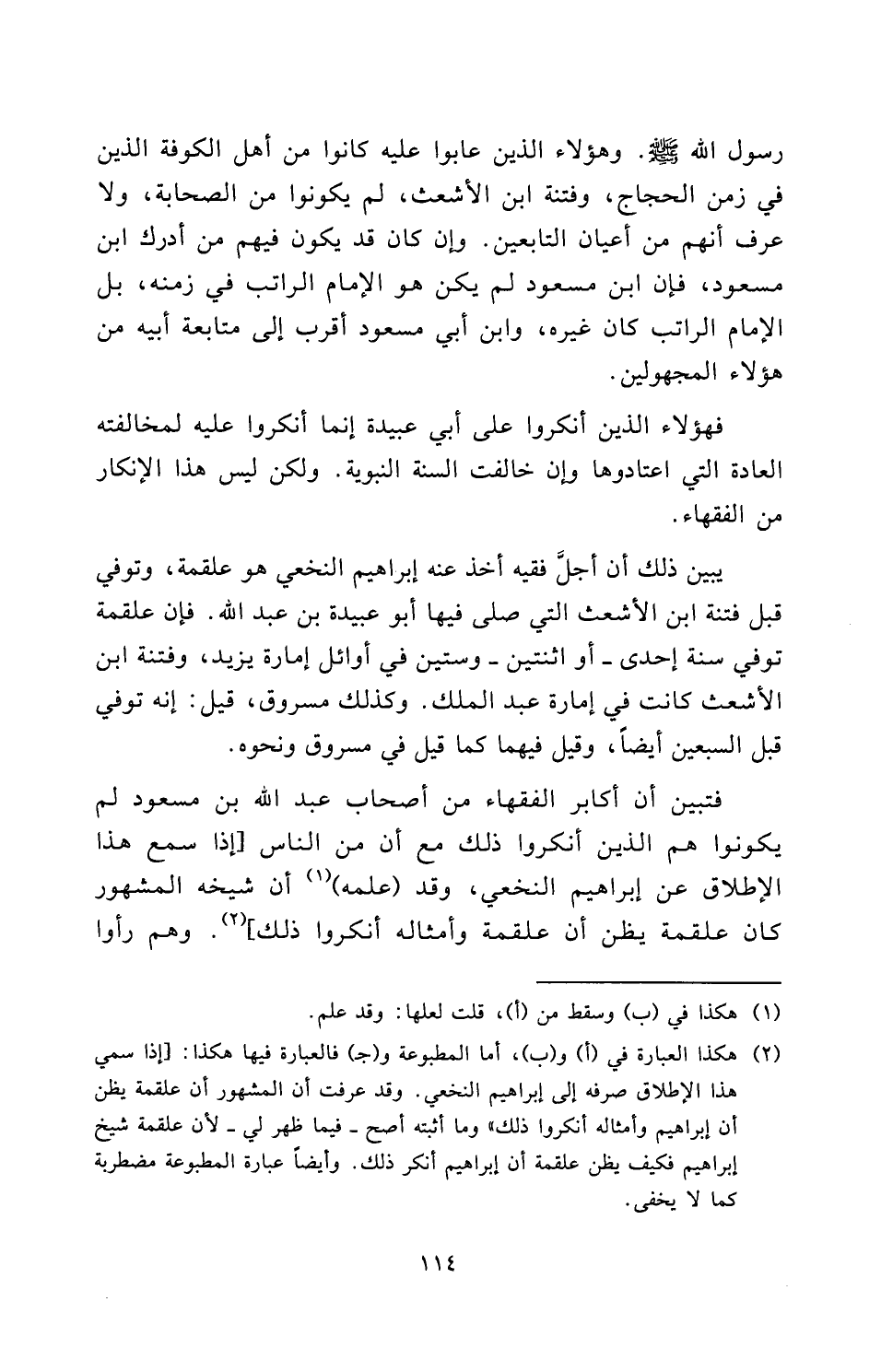 يُبَيِّنُ ذَلِكَ أَنَّ أَجَلَّ فَقِيهٍ أَخَذَ عَنْهُ إِبْرَاهِيمُ النَّخَعِيُّ هُوَ علقمة، وَتُوُفِّيَ قَبْلَ فِتْنَةِ ابْنِ الْأَشْعَثِ الَّتِي صَلَّى فِيهَا أَبُو عبيدة بن عبد الله، فَإِنَّ علقمة تُوَفِّيَ سَنَةَ إِحْدَى أَوِ اثْنَتَيْنِ وَسِتِّينَ فِي أَوَائِلِ إِمَارَةِ يزيد، وَفِتْنَةُ ابْنِ الْأَشْعَثِ كَانَتْ فِي إِمَارَةِ عبد الملك، وَكَذَلِكَ مسروق، قِيلَ: إِنَّهُ تُوُفِّيَ قَبْلَ السَّبْعِينَ أَيْضًا، وَقِيلَ فِيهِمَا كَمَا قِيلَ فِي مسروق وَنَحْوَهُ.