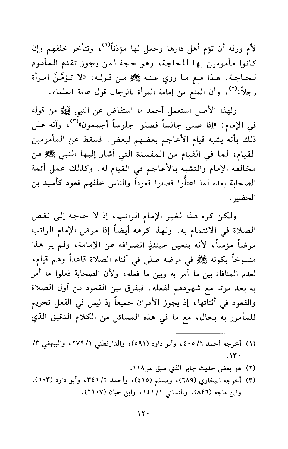 وَلِهَذَا الْأَصْلِ اسْتَعْمَلَ أحمد مَا اسْتَفَاضَ عَنِ النَّبِيِّ صَلَّى اللَّهُ عَلَيْهِ وَسَلَّمَ مِنْ قَوْلِهِ فِي الْإِمَامِ: " «إِذَا صَلَّى جَالِسًا فَصَلُّوا جُلُوسًا أَجْمَعُونَ» " وَأَنَّهُ عَلَّلَ ذَلِكَ بِأَنَّهُ يُشْبِهُ قِيَامَ الْأَعَاجِمِ بَعْضِهِمْ لِبَعْضٍ، فَسَقَطَ عَنِ الْمَأْمُومِينَ الْقِيَامُ لِمَا فِي الْقِيَامِ مِنَ الْمَفْسَدَةِ الَّتِي أَشَارَ إِلَيْهَا النَّبِيُّ صَلَّى اللَّهُ عَلَيْهِ وَسَلَّمَ مِنْ مُخَالَفَةِ الْإِمَامِ وَالتَّشَبُّهِ بِالْأَعَاجِمِ فِي الْقِيَامِ لَهُ، وَكَذَلِكَ عَمِلَ أَئِمَّةُ الصَّحَابَةِ بَعْدَهُ لَمَّا اعْتَلُّوا فَصَلَّوْا قُعُودًا وَالنَّاسُ خَلْفَهُمْ قُعُودٌ كَأُسَيْدِ بْنِ الْحُضَيْرِ.