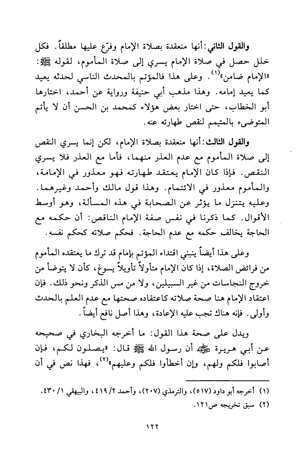 وَالْقَوْلُ الثَّالِثُ: أَنَّهَا مُنْعَقِدَةٌ بِصَلَاةِ الْإِمَامِ، لَكِنْ إِنَّمَا يَسْرِي النَّقْصُ إِلَى صَلَاةِ الْمَأْمُومِ مَعَ عَدَمِ الْعُذْرِ مِنْهُمَا، فَأَمَّا مَعَ الْعُذْرِ فَلَا يَسْرِي النَّقْصُ، فَإِذَا كَانَ الْإِمَامُ يَعْتَقِدُ طَهَارَتَهُ فَهُوَ مَعْذُورٌ فِي الْإِمَامَةِ وَالْمَأْمُومُ مَعْذُورٌ فِي الِائْتِمَامِ، وَهَذَا قَوْلُ مالك وأحمد وَغَيْرِهِمَا، وَعَلَيْهِ يَنْزِلُ مَا يُؤْثَرُ عَنِ الصَّحَابَةِ فِي هَذِهِ الْمَسْأَلَةِ وَهُوَ أَوْسَطُ الْأَقْوَالِ، كَمَا ذَكَرْنَا فِي نَفْسِ صِفَةِ الْإِمَامِ النَّاقِصِ: أَنَّ حُكْمَهُ مَعَ الْحَاجَةِ يُخَالِفُ حُكْمَهُ مَعَ عَدَمِ الْحَاجَةِ، فَحُكْمُ صَلَاتِهِ كَحُكْمِ نَفْسِهِ.