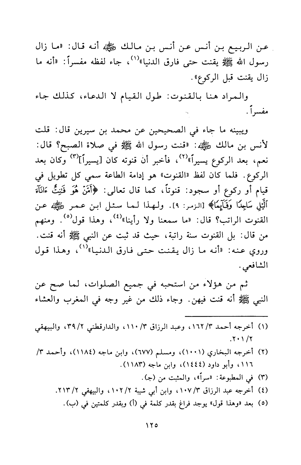 عَنِ الرَّبِيعِ بْنِ أَنَسٍ، عَنْ أَنَسِ بْنِ مَالِكٍ رَضِيَ اللَّهُ عَنْهُ أَنَّهُ قَالَ: " «مَا زَالَ رَسُولُ اللَّهِ صَلَّى اللَّهُ عَلَيْهِ وَسَلَّمَ يَقْنُتُ حَتَّى فَارَقَ الدُّنْيَا " جَاءَ لَفْظُهُ مُفَسَّرًا: " أَنَّهُ مَا زَالَ يَقْنُتُ قَبْلَ الرُّكُوعِ» ".