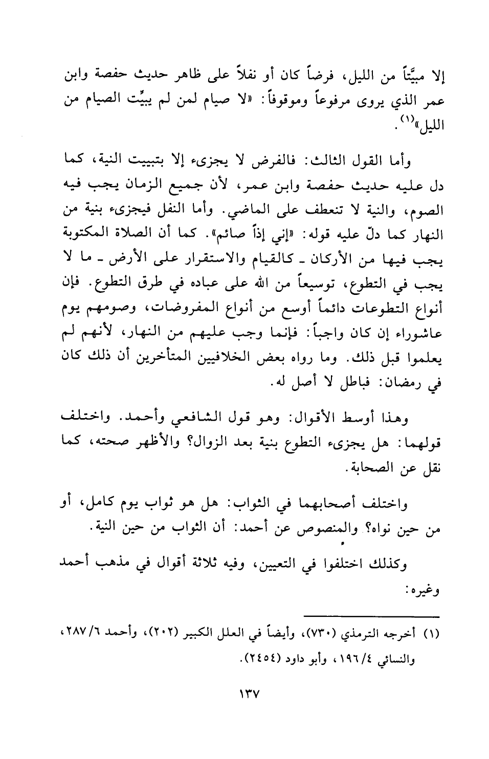 إِلَّا مُبَيَّتًا مِنَ اللَّيْلِ، فَرْضًا كَانَ أَوْ نَفْلًا عَلَى ظَاهِرِ حَدِيثِ حفصة وَابْنِ عُمَرَ الَّذِي يُرْوَى مَرْفُوعًا وَمَوْقُوفًا: " «لَا صِيَامَ لِمَنْ لَمْ يُبَيِّتِ الصِّيَامَ مِنَ اللَّيْلِ» ".
