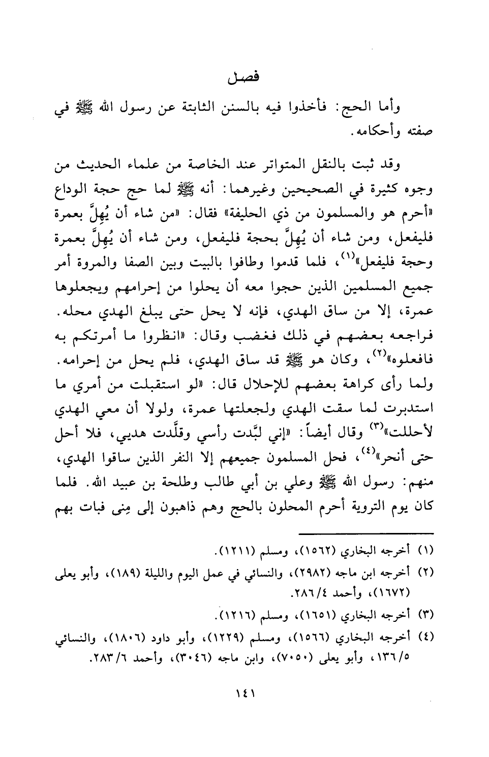 وَقَدْ ثَبَتَ بِالنَّقْلِ الْمُتَوَاتِرِ عِنْدَ الْخَاصَّةِ مِنْ عُلَمَاءِ الْحَدِيثِ مِنْ وُجُوهٍ كَثِيرَةٍ فِي الصَّحِيحَيْنِ وَغَيْرِهِمَا: «أَنَّهُ - صَلَّى اللَّهُ عَلَيْهِ وَسَلَّمَ - لَمَّا حَجَّ حَجَّةَ الْوَدَاعِ " أَحْرَمَ هُوَ وَالْمُسْلِمُونَ مِنْ ذِي الْحُلَيْفَةِ " فَقَالَ: " مَنْ شَاءَ أَنْ يُهِلَّ بِعُمْرَةٍ فَلْيَفْعَلْ، وَمَنْ شَاءَ أَنْ يُهِلَّ بِحَجَّةٍ فَلْيَفْعَلْ، وَمَنْ شَاءَ أَنْ يُهِلَّ بِعُمْرَةٍ وَحَجَّةٍ فَلْيَفْعَلْ "، فَلَمَّا قَدِمُوا وَطَافُوا بِالْبَيْتِ وَبَيْنَ الصَّفَا وَالْمَرْوَةِ أَمَرَ جَمِيعَ الْمُسْلِمِينَ الَّذِينَ حَجُّوا مَعَهُ أَنْ يَحِلُّوا مِنْ إِحْرَامِهِمْ وَيَجْعَلُوهَا عُمْرَةً، إِلَّا مَنْ سَاقَ الْهَدْيَ فَإِنَّهُ لَا يَحِلُّ حَتَّى يَبْلُغَ الْهَدْيُ مَحِلَّهُ فَرَاجَعَهُ بَعْضُهُمْ فِي ذَلِكَ فَغَضِبَ وَقَالَ: " انْظُرُوا مَا أَمَرْتُكُمْ بِهِ فَافْعَلُوهُ» "، وَكَانَ هُوَ - صَلَّى اللَّهُ عَلَيْهِ وَسَلَّمَ - قَدْ سَاقَ الْهَدْيَ، فَلَمْ يَحِلَّ مِنْ إِحْرَامِهِ. وَلَمَّا رَأَى كَرَاهَةَ بَعْضِهِمْ لِلْإِحْلَالِ قَالَ: " «لَوِ اسْتَقْبَلْتُ مِنْ أَمْرِي مَا اسْتَدْبَرْتُ لَمَا سُقْتُ الْهَدْيَ وَلَجَعَلْتُهَا عُمْرَةً، وَلَوْلَا أَنَّ مَعِيَ الْهَدْيَ لَأَحْلَلْتُ» " وَقَالَ أَيْضًا: " «إِنِّي لَبَّدْتُ رَأْسِي وَقَلَّدْتُ هَدْيِي، فَلَا أَحِلُّ حَتَّى أَنْحَرَ» " «فَحَلَّ الْمُسْلِمُونَ جَمِيعُهُمْ إِلَّا النَّفَرَ الَّذِينَ سَاقُوا الْهَدْيَ، مِنْهُمْ: رَسُولُ اللَّهِ - صَلَّى اللَّهُ عَلَيْهِ وَسَلَّمَ - وَعَلِيُّ بْنُ أَبِي طَالِبٍ وَطَلْحَةُ بْنُ عُبَيْدِ اللَّهِ. فَلَمَّا كَانَ يَوْمُ التَّرْوِيَةِ أَحْرَمَ الْمُحِلُّونَ بِالْحَجِّ وَهُمْ ذَاهِبُونَ إِلَى مِنًى فَبَاتَ بِهِمْ