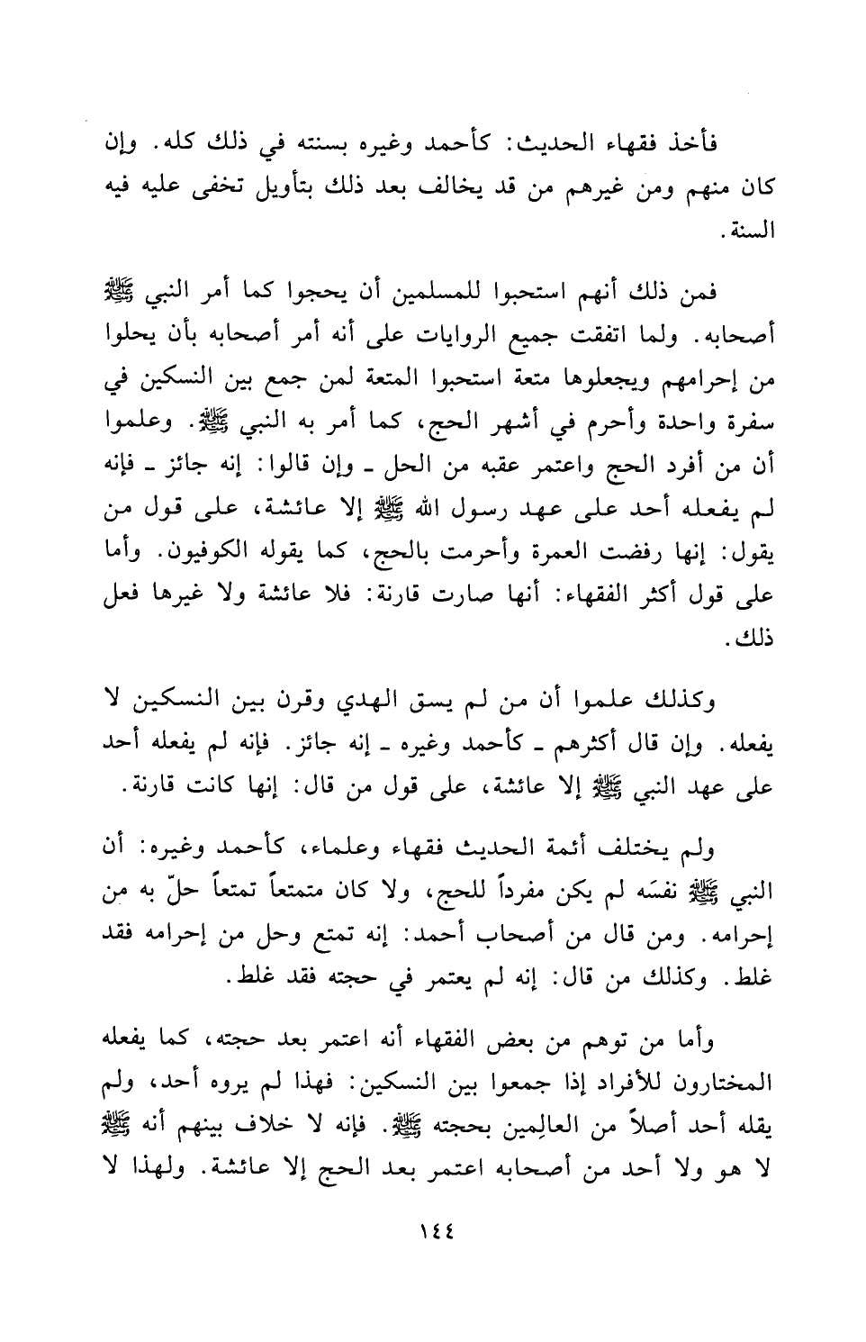 وَلَمْ يَخْتَلِفْ أَئِمَّةُ الْحَدِيثِ فُقَهَاءٌ وَعُلَمَاءٌ، كأحمد وَغَيْرِهِ: أَنَّ النَّبِيَّ - صَلَّى اللَّهُ عَلَيْهِ وَسَلَّمَ - نَفْسَهُ لَمْ يَكُنْ مُفْرِدًا لِلْحَجِّ، وَلَا كَانَ مُتَمَتِّعًا تَمَتُّعًا حَلَّ بِهِ مِنْ إِحْرَامِهِ. وَمَنْ قَالَ مِنْ أَصْحَابِ أحمد: إِنَّهُ تَمَتَّعَ وَحَلَّ مِنْ إِحْرَامِهِ فَقَدْ غَلِطَ. وَكَذَلِكَ مَنْ قَالَ: إِنَّهُ لَمْ يَعْتَمِرْ فِي حَجَّتِهِ فَقَدْ غَلِطَ.