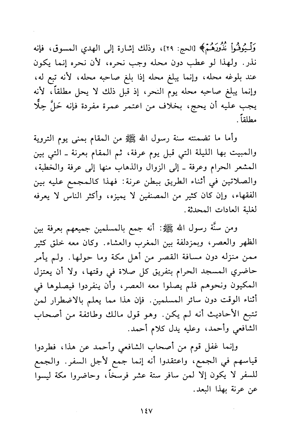 وَمِنْ سُنَّةِ رَسُولِ اللَّهِ - صَلَّى اللَّهُ عَلَيْهِ وَسَلَّمَ -: أَنَّهُ جَمَعَ بِالْمُسْلِمِينَ جَمِيعِهِمْ بِعَرَفَةَ بَيْنَ الظُّهْرِ وَالْعَصْرِ، وَبِمُزْدَلِفَةَ بَيْنَ الْمَغْرِبِ وَالْعِشَاءِ. وَكَانَ مَعَهُ خَلْقٌ كَثِيرٌ مِمَّنْ مَنْزِلُهُ دُونَ مَسَافَةِ الْقَصْرِ مِنْ أَهْلِ مَكَّةَ وَمَا حَوْلَهَا. وَلَمْ يَأْمُرْ حَاضِرِي الْمَسْجِدِ الْحَرَامِ بِتَفْرِيقِ كُلِّ صَلَاةٍ فِي وَقْتِهَا، وَلَا أَنْ يَعْتَزِلَ الْمَكِّيُّونَ وَنَحْوُهُمْ فَلَمْ يُصَلُّوا مَعَهُ الْعَصْرَ، وَأَنْ يَنْفَرِدُوا فَيُصَلُّوهَا فِي أَثْنَاءِ الْوَقْتِ دُونَ سَائِرِ الْمُسْلِمِينَ، فَإِنَّ هَذَا مِمَّا يُعْلَمُ بِالِاضْطِرَارِ لِمَنْ تَتَبَّعَ الْأَحَادِيثَ أَنَّهُ لَمْ يَكُنْ. وَهُوَ قَوْلُ مالك وَطَائِفَةٍ مِنْ أَصْحَابِ الشَّافِعِيِّ وأحمد، وَعَلَيْهِ يَدُلُّ كَلَامُ أحمد.