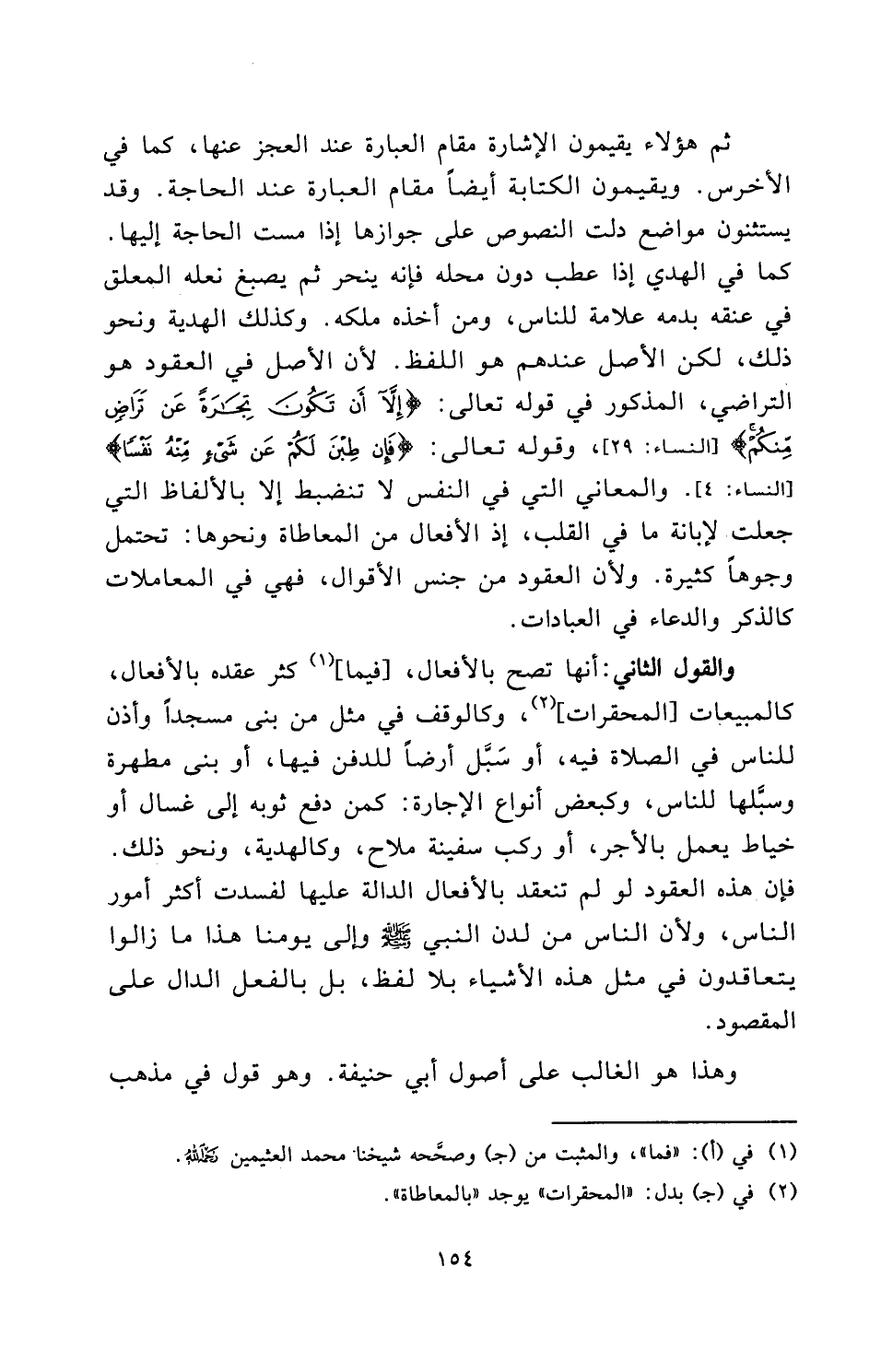 وَيُقِيمُونَ الْكِتَابَةَ أَيْضًا مَقَامَ الْعِبَارَةِ عِنْدَ الْحَاجَةِ. وَقَدْ يَسْتَثْنُونَ مَوَاضِعَ دَلَّتِ النُّصُوصُ عَلَى جَوَازِهَا إِذَا مَسَّتِ الْحَاجَةُ إِلَيْهَا. كَمَا فِي الْهَدْيِ إِذَا عَطِبَ دُونَ مَحِلِّهِ فَإِنَّهُ يُنْحَرُ ثُمَّ يُصْبَغُ نَعْلُهُ الْمُعَلَّقُ فِي عُنُقِهِ بِدَمِهِ عَلَامَةً لِلنَّاسِ، وَمَنْ أَخَذَهُ مَلَكَهُ. وَكَذَلِكَ الْهَدِيَّةُ وَنَحْوُ ذَلِكَ، لَكِنَّ الْأَصْلَ عِنْدَهُمْ هُوَ اللَّفْظُ؛ لِأَنَّ الْأَصْلَ فِي الْعُقُودِ هُوَ التَّرَاضِي، الْمَذْكُورُ فِي قَوْلِهِ تَعَالَى: {إِلَّا أَنْ تَكُونَ تِجَارَةً عَنْ تَرَاضٍ مِنْكُمْ} [النساء: 29] [النِّسَاءِ: 29] ، وَقَوْلِهِ تَعَالَى: {فَإِنْ طِبْنَ لَكُمْ عَنْ شَيْءٍ مِنْهُ نَفْسًا} [النساء: 4] [النِّسَاءِ: 4] . وَالْمَعَانِي الَّتِي فِي النَّفْسِ لَا تَنْضَبِطُ إِلَّا بِالْأَلْفَاظِ الَّتِي جُعِلَتْ لِإِبَانَةِ مَا فِي الْقَلْبِ، إِذِ الْأَفْعَالُ مِنَ الْمُعَاطَاةِ وَنَحْوِهَا: تَحْتَمِلُ وُجُوهًا كَثِيرَةً؛ وَلِأَنَّ الْعُقُودَ مِنْ جِنْسِ الْأَقْوَالِ، فَهِيَ فِي الْمُعَامَلَاتِ كَالذِّكْرِ وَالدُّعَاءِ فِي الْعِبَادَاتِ.