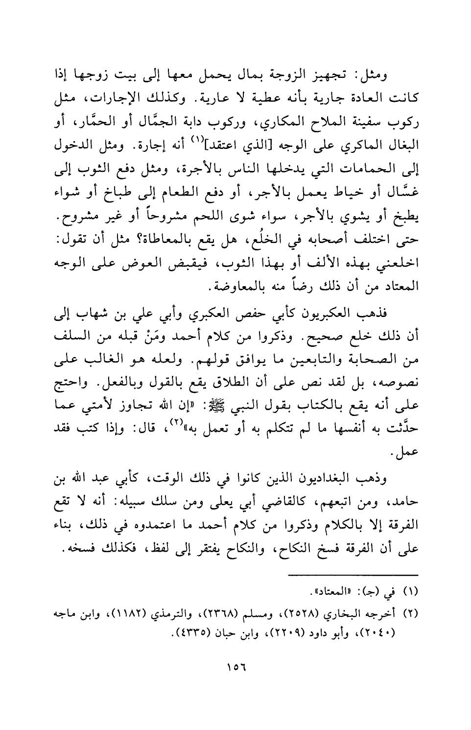 فَذَهَبَ الْعُكْبَرِيُّونَ كأبي حفص العكبري وأبي علي بن شهاب إِلَى أَنَّ ذَلِكَ خُلْعٌ صَحِيحٌ، وَذَكَرُوا مِنْ كَلَامِ أحمد وَمَنْ قَبْلَهُ مِنَ السَّلَفِ مِنَ الصَّحَابَةِ وَالتَّابِعِينَ مَا يُوَافِقُ قَوْلَهُمْ، وَلَعَلَّهُ هُوَ الْغَالِبُ عَلَى نُصُوصِهِ، بَلْ لَقَدْ نَصَّ عَلَى أَنَّ الطَّلَاقَ يَقَعُ بِالْقَوْلِ وَبِالْفِعْلِ، وَاحْتَجَّ عَلَى أَنَّهُ يَقَعُ بِالْكِتَابِ بِقَوْلِ النَّبِيِّ - صَلَّى اللَّهُ عَلَيْهِ وَسَلَّمَ -: «إِنَّ اللَّهَ تَجَاوَزَ لِأُمَّتِي عَمَّا حَدَّثَتْ بِهِ أَنْفُسَهَا مَا لَمْ تَتَكَلَّمْ بِهِ أَوْ تَعْمَلْ بِهِ» ، قَالَ: وَإِذَا كَتَبَ فَقَدْ عَمِلَ.
