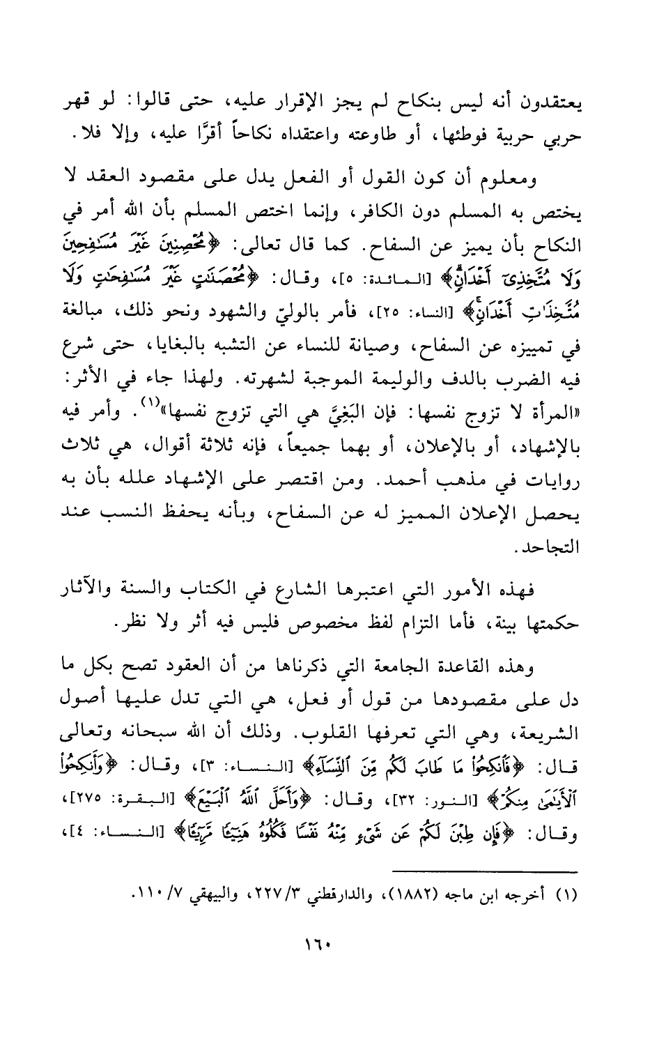 وَمَعْلُومٌ أَنَّ كَوْنَ الْقَوْلِ أَوِ الْفِعْلِ يَدُلُّ عَلَى مَقْصُودِ الْعَقْدِ لَا يَخْتَصُّ بِهِ الْمُسْلِمُ دُونَ الْكَافِرِ، وَإِنَّمَا اخْتَصَّ الْمُسْلِمُ بِأَنَّ اللَّهَ أَمَرَ فِي النِّكَاحِ بِأَنْ يُمَيَّزَ عَنِ السِّفَاحِ، كَمَا قَالَ تَعَالَى: {مُحْصِنِينَ غَيْرَ مُسَافِحِينَ وَلَا مُتَّخِذِي أَخْدَانٍ} [المائدة: 5] [الْمَائِدَةِ: 5] ، وَقَالَ: {مُحْصَنَاتٍ غَيْرَ مُسَافِحَاتٍ وَلَا مُتَّخِذَاتِ أَخْدَانٍ} [النساء: 25] [النِّسَاءِ: 25] فَأَمَرَ بِالْوَلِيِّ وَالشُّهُودِ وَنَحْوِ ذَلِكَ، مُبَالَغَةً فِي تَمْيِيزِهِ عَنِ السِّفَاحِ، وَصِيَانَةً لِلنِّسَاءِ عَنِ التَّشَبُّهِ بِالْبَغَايَا، حَتَّى شَرَعَ فِيهِ الضَّرْبَ بِالدُّفِّ وَالْوَلِيمَةَ الْمُوجِبَةَ لِشُهْرَتِهِ، وَلِهَذَا جَاءَ فِي الْأَثَرِ: " «الْمَرْأَةُ لَا تُزَوِّجُ نَفْسَهَا: فَإِنَّ الْبَغِيَّ هِيَ الَّتِي تُزَوِّجُ نَفْسَهَا» " وَأَمَرَ فِيهِ بِالْإِشْهَادِ، أَوْ بِالْإِعْلَانِ، أَوْ بِهِمَا جَمِيعًا، فَإِنَّهُ ثَلَاثَةُ أَقْوَالٍ، هِيَ ثَلَاثُ رِوَايَاتٍ فِي مَذْهَبِ أحمد، وَمَنِ اقْتَصَرَ عَلَى الْإِشْهَادِ عَلَّلَهُ بِأَنَّ بِهِ يَحْصُلُ الْإِعْلَانُ الْمُمَيِّزُ لَهُ عَنِ السِّفَاحِ، وَبِأَنَّهُ يَحْفَظُ النَّسَبَ عِنْدَ التَّجَاحُدِ.