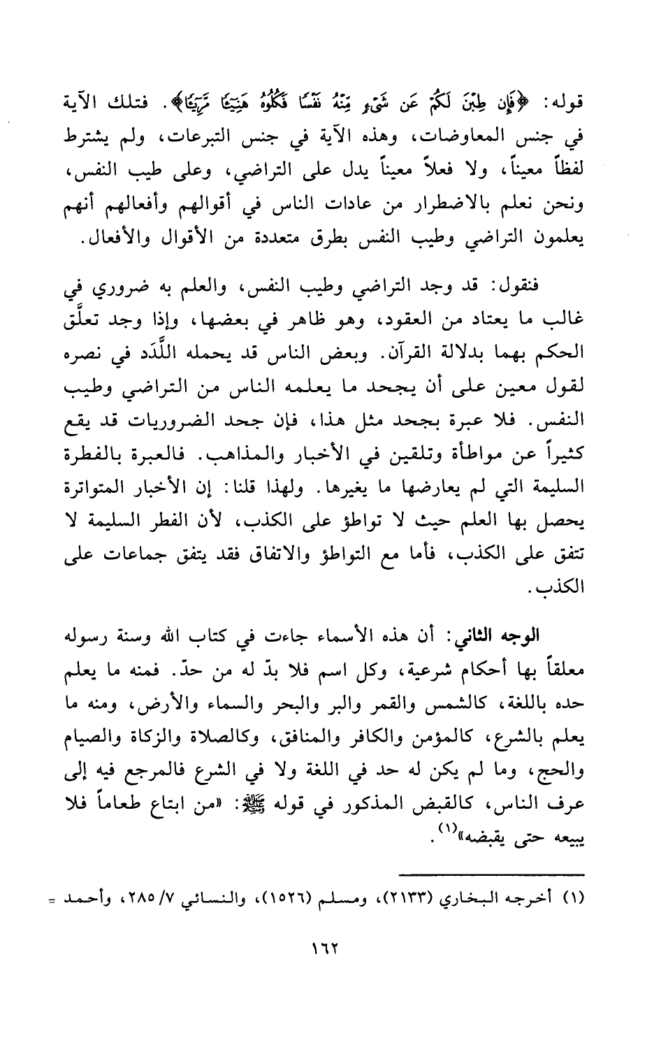 قَوْلِهِ: {فَإِنْ طِبْنَ لَكُمْ عَنْ شَيْءٍ مِنْهُ نَفْسًا فَكُلُوهُ هَنِيئًا مَرِيئًا} [النساء: 4] فَتِلْكَ الْآيَةُ فِي جِنْسِ الْمُعَاوَضَاتِ، وَهَذِهِ الْآيَةُ فِي جِنْسِ التَّبَرُّعَاتِ، وَلَمْ يَشْتَرِطْ لَفْظًا مُعَيَّنًا، وَلَا فِعْلًا مُعَيَّنًا يَدُلُّ عَلَى التَّرَاضِي، وَعَلَى طِيبِ النَّفْسِ، وَنَحْنُ نَعْلَمُ بِالِاضْطِرَارِ مِنْ عَادَاتِ النَّاسِ فِي أَقْوَالِهِمْ وَأَفْعَالِهِمْ أَنَّهُمْ يَعْلَمُونَ التَّرَاضِي وَطِيبَ النَّفْسِ بِطُرُقٍ مُتَعَدِّدَةٍ مِنَ الْأَقْوَالِ وَالْأَفْعَالِ.