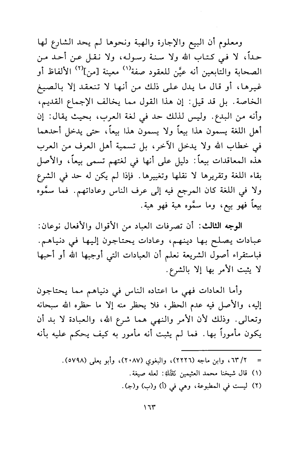 وَمَعْلُومٌ أَنَّ الْبَيْعَ وَالْإِجَارَةَ وَالْهِبَةَ وَنَحْوَهَا لَمْ يَحُدَّ الشَّارِعُ لَهَا حَدًّا، لَا فِي كِتَابِ اللَّهِ وَلَا سُنَّةِ رَسُولِهِ، وَلَا نُقِلَ عَنْ أَحَدٍ مِنَ الصَّحَابَةِ وَالتَّابِعِينَ أَنَّهُ عَيَّنَ لِلْعُقُودِ صِفَةً مُعَيَّنَةً [مِنَ] الْأَلْفَاظِ أَوْ غَيْرِهَا، أَوْ قَالَ مَا يَدُلُّ عَلَى ذَلِكَ مِنْ أَنَّهَا لَا تَنْعَقِدُ إِلَّا بِالصِّيَغِ الْخَاصَّةِ، بَلْ قَدْ قِيلَ: إِنَّ هَذَا الْقَوْلَ مِمَّا يُخَالِفُ الْإِجْمَاعَ الْقَدِيمَ، وَأَنَّهُ مِنَ الْبِدَعِ، وَلَيْسَ لِذَلِكَ حَدٌّ فِي لُغَةِ الْعَرَبِ، بِحَيْثُ يُقَالُ: إِنَّ أَهْلَ اللُّغَةِ يُسَمُّونَ هَذَا بَيْعًا وَلَا يُسَمُّونَ هَذَا بَيْعًا، حَتَّى يُدْخِلَ أَحَدَهُمَا فِي خِطَابِ اللَّهِ وَلَا يُدْخِلَ الْآخَرَ، بَلْ تَسْمِيَةُ أَهْلِ الْعُرْفِ مِنَ الْعَرَبِ هَذِهِ الْمُعَاقَدَاتِ بَيْعًا: دَلِيلٌ عَلَى أَنَّهَا فِي لُغَتِهِمْ تُسَمَّى بَيْعًا، وَالْأَصْلُ بَقَاءُ اللُّغَةِ وَتَقْرِيرُهَا لَا نَقْلُهَا وَتَغْيِيرُهَا، فَإِذَا لَمْ يَكُنْ لَهُ حَدٌّ فِي الشَّرْعِ وَلَا فِي اللُّغَةِ كَانَ الْمَرْجِعُ فِيهِ إِلَى عُرْفِ النَّاسِ وَعَادَاتِهِمْ، فَمَا سَمَّوْهُ بَيْعًا فَهُوَ بَيْعٌ، وَمَا سَمَّوْهُ هِبَةً فَهُوَ هِبَةٌ.