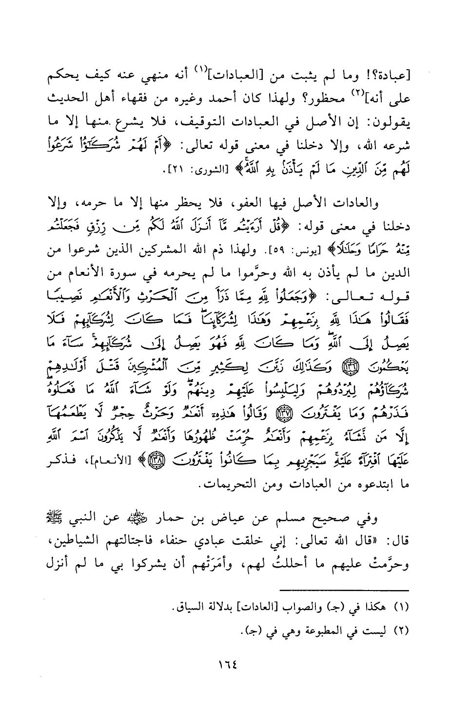 وَالْعَادَاتُ الْأَصْلُ فِيهَا الْعَفْوُ، فَلَا يُحْظَرُ مِنْهَا إِلَّا مَا حَرَّمَهُ، وَإِلَّا دَخَلْنَا فِي مَعْنَى قَوْلِهِ: {قُلْ أَرَأَيْتُمْ مَا أَنْزَلَ اللَّهُ لَكُمْ مِنْ رِزْقٍ فَجَعَلْتُمْ مِنْهُ حَرَامًا وَحَلَالًا} [يونس: 59] [يُونُسَ: 59] ، وَلِهَذَا ذَمَّ اللَّهُ الْمُشْرِكِينَ الَّذِينَ شَرَعُوا مِنَ الدِّينِ مَا لَمْ يَأْذَنْ بِهِ اللَّهُ وَحَرَّمُوا مَا لَمْ يُحَرِّمْهُ فِي سُورَةِ الْأَنْعَامِ مِنْ قَوْلِهِ تَعَالَى: {وَجَعَلُوا لِلَّهِ مِمَّا ذَرَأَ مِنَ الْحَرْثِ وَالْأَنْعَامِ نَصِيبًا فَقَالُوا هَذَا لِلَّهِ بِزَعْمِهِمْ وَهَذَا لِشُرَكَائِنَا فَمَا كَانَ لِشُرَكَائِهِمْ فَلَا يَصِلُ إِلَى اللَّهِ وَمَا كَانَ لِلَّهِ فَهُوَ يَصِلُ إِلَى شُرَكَائِهِمْ سَاءَ مَا يَحْكُمُونَ - وَكَذَلِكَ زَيَّنَ لِكَثِيرٍ مِنَ الْمُشْرِكِينَ قَتْلَ أَوْلَادِهِمْ شُرَكَاؤُهُمْ لِيُرْدُوهُمْ وَلِيَلْبِسُوا عَلَيْهِمْ دِينَهُمْ وَلَوْ شَاءَ اللَّهُ مَا فَعَلُوهُ فَذَرْهُمْ وَمَا يَفْتَرُونَ - وَقَالُوا هَذِهِ أَنْعَامٌ وَحَرْثٌ حِجْرٌ لَا يَطْعَمُهَا إِلَّا مَنْ نَشَاءُ بِزَعْمِهِمْ وَأَنْعَامٌ حُرِّمَتْ ظُهُورُهَا وَأَنْعَامٌ لَا يَذْكُرُونَ اسْمَ اللَّهِ عَلَيْهَا افْتِرَاءً عَلَيْهِ سَيَجْزِيهِمْ بِمَا كَانُوا يَفْتَرُونَ} [الأنعام: 136 - 138] [الْأَنْعَامِ] ، فَذَكَرَ مَا ابْتَدَعُوهُ مِنَ الْعِبَادَاتِ وَمِنَ التَّحْرِيمَاتِ.
