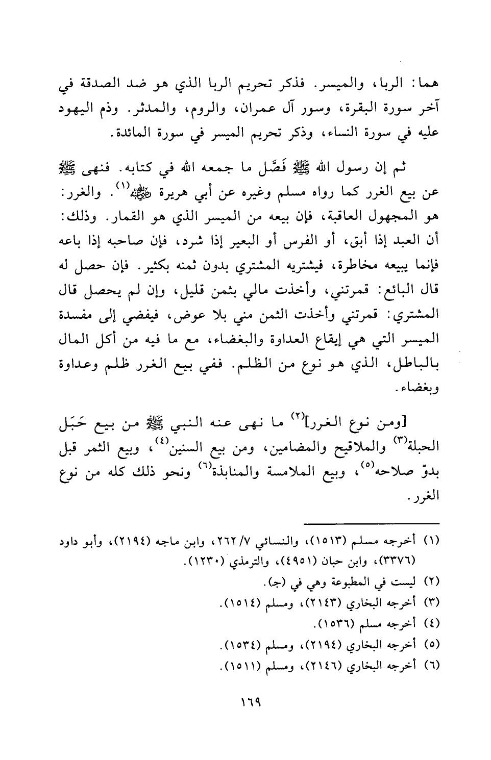 ثُمَّ إِنَّ رَسُولَ اللَّهِ - صَلَّى اللَّهُ عَلَيْهِ وَسَلَّمَ - فَصَّلَ مَا جَمَعَهُ اللَّهُ فِي كِتَابِهِ. «فَنَهَى - صَلَّى اللَّهُ عَلَيْهِ وَسَلَّمَ - عَنْ بَيْعِ الْغَرَرِ» كَمَا رَوَاهُ مسلم وَغَيْرُهُ عَنْ أَبِي هُرَيْرَةَ - رَضِيَ اللَّهُ عَنْهُ -. وَالْغَرَرُ: هُوَ الْمَجْهُولُ الْعَاقِبَةِ، فَإِنَّ بَيْعَهُ مِنَ الْمَيْسِرِ الَّذِي هُوَ الْقِمَارُ. وَذَلِكَ: أَنَّ الْعَبْدَ إِذَا أَبَقَ، أَوِ الْفَرَسَ أَوِ الْبَعِيرَ إِذَا شَرَدَ، فَإِنَّ صَاحِبَهُ إِذَا بَاعَهُ فَإِنَّمَا يَبِيعُهُ مُخَاطَرَةً، فَيَشْتَرِيهِ الْمُشْتَرِي بِدُونِ ثَمَنِهِ بِكَثِيرٍ. فَإِنْ حَصَلَ لَهُ قَالَ الْبَائِعُ: قَمَرْتَنِي، وَأَخَذْتَ مَالِي بِثَمَنٍ قَلِيلٍ، وَإِنْ لَمْ يَحْصُلْ قَالَ الْمُشْتَرِي: قَمَرْتَنِي وَأَخَذْتَ الثَّمَنَ مِنِّي بِلَا عِوَضٍ، فَيُفْضِي إِلَى مَفْسَدَةِ الْمَيْسِرِ الَّتِي هِيَ إِيقَاعُ الْعَدَاوَةِ وَالْبَغْضَاءِ، مَعَ مَا فِيهِ مِنْ أَكْلِ الْمَالِ بِالْبَاطِلِ، الَّذِي هُوَ نَوْعٌ مِنَ الظُّلْمِ، فَفِي بَيْعِ الْغَرَرِ ظُلْمٌ وَعَدَاوَةٌ وَبَغْضَاءُ.