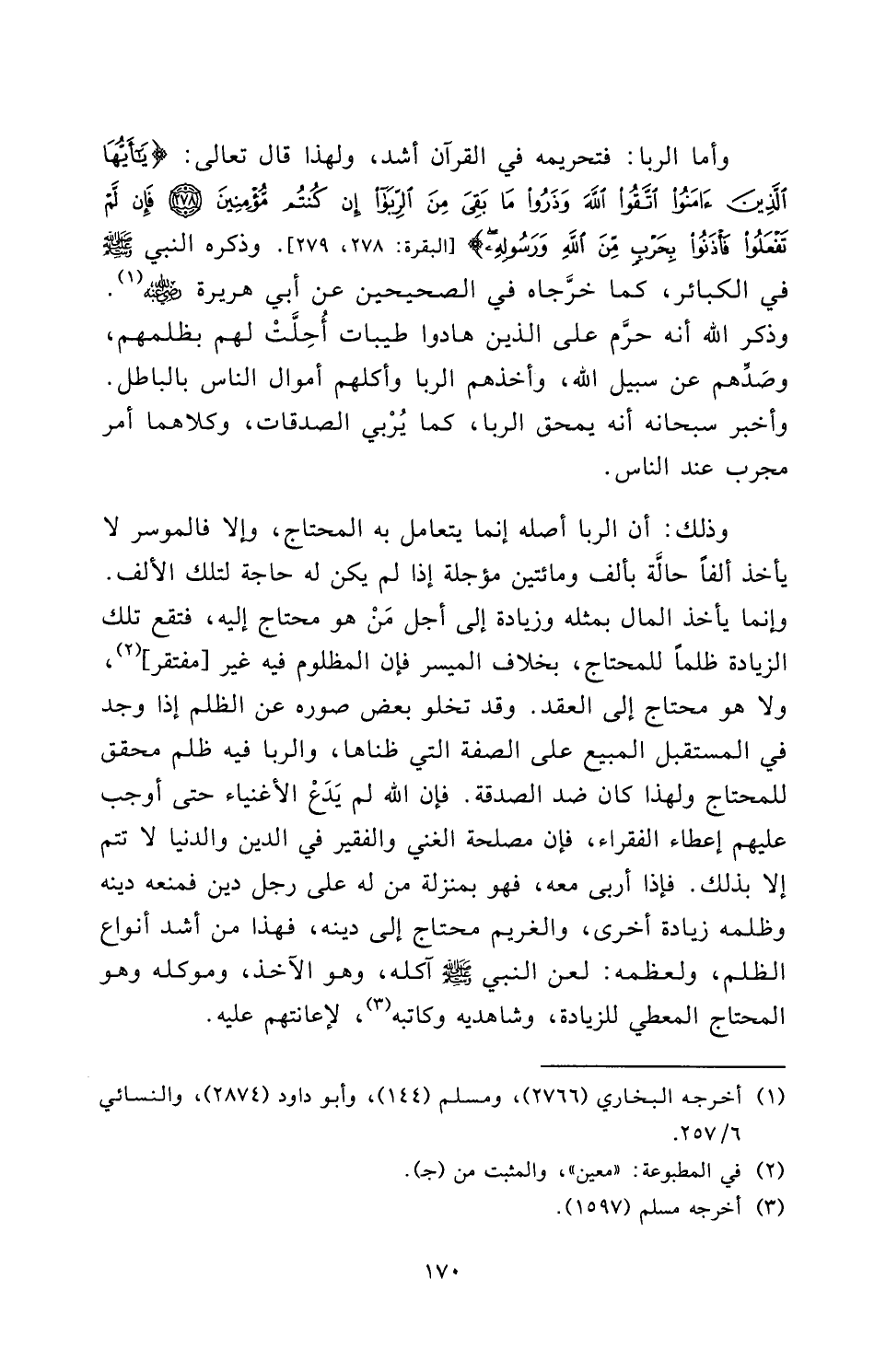وَأَمَّا الرِّبَا: فَتَحْرِيمُهُ فِي الْقُرْآنِ أَشَدُّ، وَلِهَذَا قَالَ تَعَالَى: {يَاأَيُّهَا الَّذِينَ آمَنُوا اتَّقُوا اللَّهَ وَذَرُوا مَا بَقِيَ مِنَ الرِّبَا إِنْ كُنْتُمْ مُؤْمِنِينَ - فَإِنْ لَمْ تَفْعَلُوا فَأْذَنُوا بِحَرْبٍ مِنَ اللَّهِ وَرَسُولِهِ} [البقرة: 278 - 279] [الْبَقَرَةِ: 278، 279] ، وَذَكَرَهُ النَّبِيُّ - صَلَّى اللَّهُ عَلَيْهِ وَسَلَّمَ - فِي الْكَبَائِرِ كَمَا خَرَّجَاهُ فِي الصَّحِيحَيْنِ عَنْ أَبِي هُرَيْرَةَ - رَضِيَ اللَّهُ عَنْهُ -، وَذَكَرَ اللَّهُ أَنَّهُ حَرَّمَ عَلَى الَّذِينَ هَادُوا طَيِّبَاتٍ أُحِلَّتْ لَهُمْ بِظُلْمِهِمْ، وَصَدِّهِمْ عَنْ سَبِيلِ اللَّهِ، وَأَخْذِهِمُ الرِّبَا وَأَكْلِهِمْ أَمْوَالَ النَّاسِ بِالْبَاطِلِ. وَأَخْبَرَ سُبْحَانَهُ أَنَّهُ يَمْحَقُ الرِّبَا، كَمَا يُرْبِي الصَّدَقَاتِ، وَكِلَاهُمَا أَمْرٌ مُجَرَّبٌ عِنْدَ النَّاسِ.