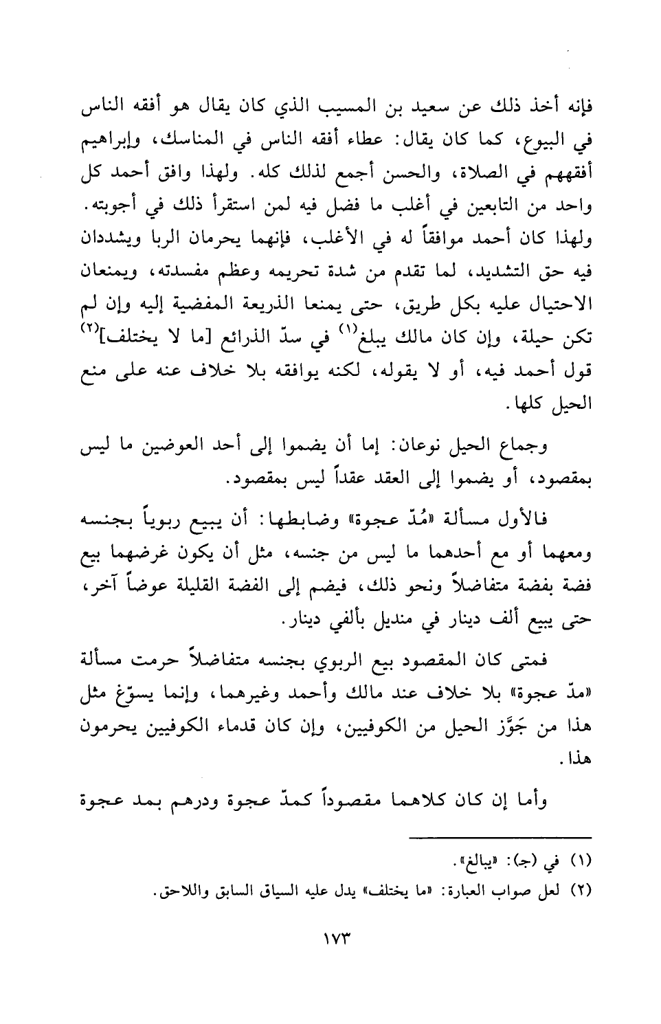 فَإِنَّهُ أَخَذَ ذَلِكَ عَنْ سَعِيدِ بْنِ الْمُسَيَّبِ الَّذِي كَانَ يُقَالُ: هُوَ أَفْقَهُ النَّاسِ فِي الْبُيُوعِ، كَمَا كَانَ يُقَالُ: عطاء أَفْقَهُ النَّاسِ فِي الْمَنَاسِكِ، وإبراهيم أَفْقَهُهُمْ فِي الصَّلَاةِ، والحسن أَجْمَعُ لِذَلِكَ كُلِّهِ؛ وَلِهَذَا وَافَقَ أحمد كُلَّ وَاحِدٍ مِنَ التَّابِعِينَ فِي أَغْلَبِ مَا فُضِّلَ فِيهِ لِمَنِ اسْتَقْرَأَ ذَلِكَ فِي أَجْوِبَتِهِ؛ وَلِهَذَا كَانَ أحمد مُوَافِقًا لَهُ فِي الْأَغْلَبِ، فَإِنَّهُمَا يُحَرِّمَانِ الرِّبَا وَيُشَدِّدَانِ فِيهِ حَقَّ التَّشْدِيدِ، لِمَا تَقَدَّمَ مِنْ شِدَّةِ تَحْرِيمِهِ وَعِظَمِ مَفْسَدَتِهِ، وَيَمْنَعَانِ الِاحْتِيَالَ لَهُ بِكُلِّ طَرِيقٍ، حَتَّى يَمْنَعَا الذَّرِيعَةَ الْمُفْضِيَةَ إِلَيْهِ وَإِنْ لَمْ تَكُنْ حِيلَةً، وَإِنْ كَانَ مالك يَبْلُغُ فِي سَدِّ الذَّرَائِعِ [مَا لَا يَخْتَلِفُ] قَوْلُ أحمد فِيهِ، أَوْ لَا يَقُولُهُ، لَكِنَّهُ يُوَافِقُهُ بِلَا خِلَافٍ عَنْهُ عَلَى مَنْعِ الْحِيَلِ كُلِّهَا.