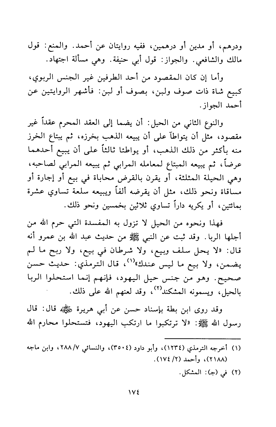فَهَذَا وَنَحْوُهُ مِنَ الْحِيَلِ لَا تَزُولُ بِهِ الْمَفْسَدَةُ الَّتِي حَرَّمَ اللَّهُ مِنْ أَجْلِهَا الرِّبَا، وَقَدْ ثَبَتَ عَنِ النَّبِيِّ - صَلَّى اللَّهُ عَلَيْهِ وَسَلَّمَ - مِنْ حَدِيثِ عَبْدِ اللَّهِ بْنِ عَمْرٍو أَنَّهُ قَالَ: «لَا يَحِلُّ سَلَفٌ وَبَيْعٌ، وَلَا شَرْطَانِ فِي بَيْعٍ، وَلَا رِبْحُ مَا لَمْ يُضْمَنْ، وَلَا بَيْعُ مَا لَيْسَ عِنْدَكَ» ، قَالَ التِّرْمِذِيُّ: حَدِيثٌ حَسَنٌ صَحِيحٌ. وَهُوَ مِنْ جِنْسِ حِيَلِ الْيَهُودِ، فَإِنَّهُمْ إِنَّمَا اسْتَحَلُّوا الرِّبَا بِالْحِيَلِ، وَيُسَمُّونَهُ المشكند، وَقَدْ لَعَنَهُمُ اللَّهُ عَلَى ذَلِكَ.