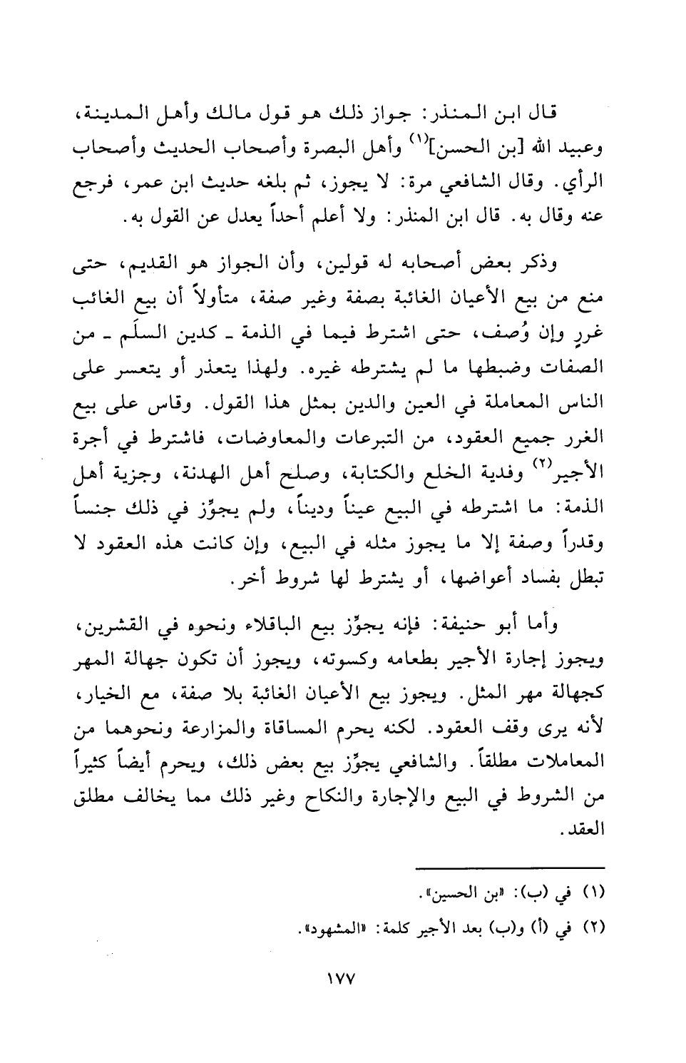 وَأَمَّا أبو حنيفة: فَإِنَّهُ يُجَوِّزُ بَيْعَ الْبَاقِلَّاءِ وَنَحْوِهِ فِي الْقِشْرَيْنِ، وَيُجَوِّزُ إِجَارَةَ الْأَجِيرِ بِطَعَامِهِ وَكُسْوَتِهِ، وَيُجَوِّزُ أَنْ تَكُونَ جَهَالَةُ الْمَهْرِ، كَجَهَالَةِ مَهْرِ الْمِثْلِ وَيَجَوِّزُ بَيْعَ الْأَعْيَانِ الْغَائِبَةِ بِلَا صِفَةٍ مَعَ الْخِيَارِ؛ لِأَنَّهُ يَرَى وَقْفَ الْعُقُودِ، لَكِنَّهُ يُحَرِّمُ الْمُسَاقَاةَ وَالْمُزَارَعَةَ وَنَحْوَهُمَا مِنَ الْمُعَامَلَاتِ مُطْلَقًا، وَالشَّافِعِيُّ يُجَوِّزُ بَيْعَ بَعْضِ ذَلِكَ، وَيُحَرِّمُ أَيْضًا كَثِيرًا مِنَ الشُّرُوطِ فِي الْبَيْعِ وَالْإِجَارَةِ وَالنِّكَاحِ وَغَيْرِ ذَلِكَ مِمَّا يُخَالِفُ مُطْلَقَ الْعَقْدِ.
