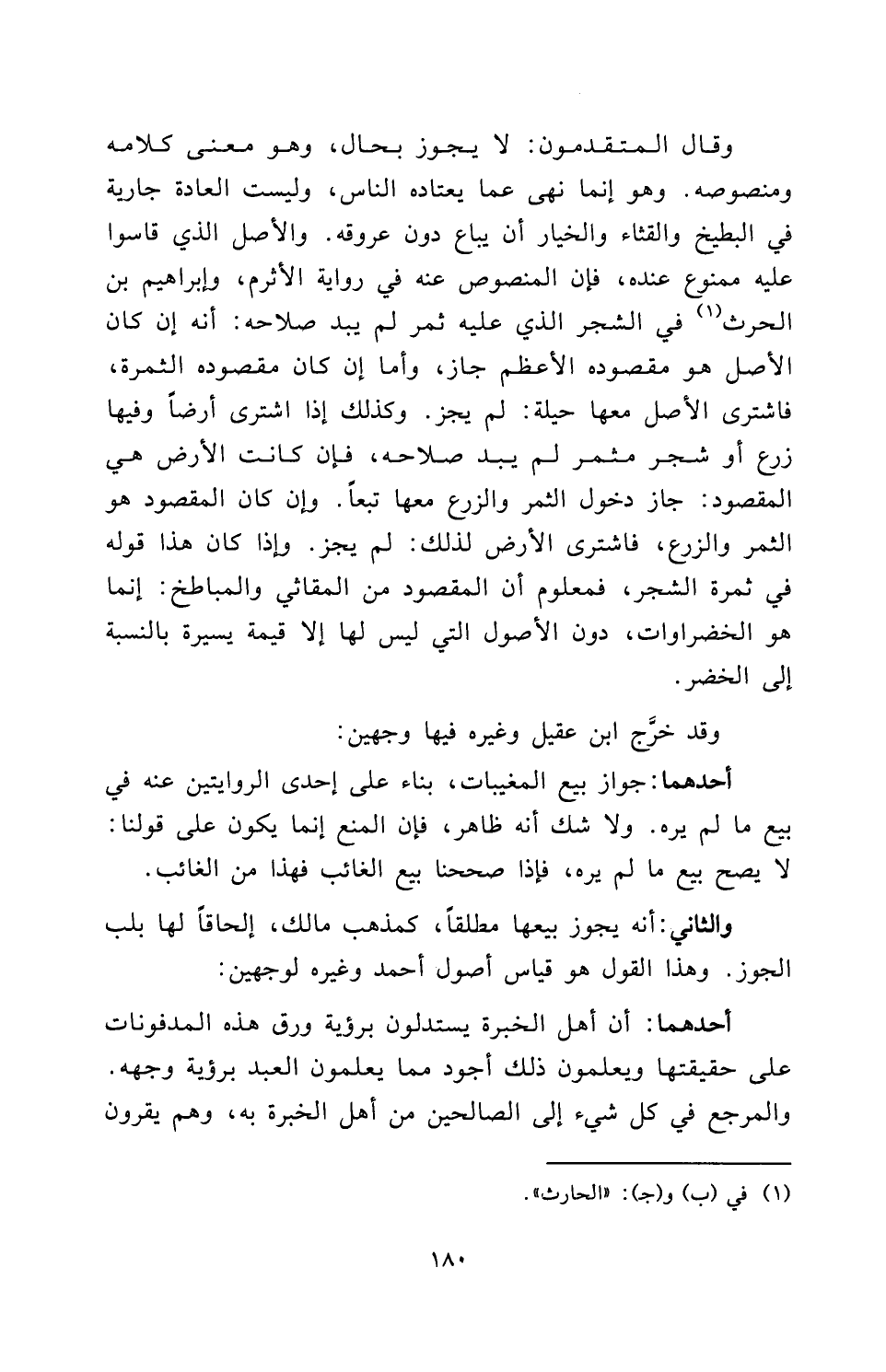 وَقَالَ الْمُتَقَدِّمُونَ: لَا يَجُوزُ بِحَالٍ، وَهُوَ مَعْنَى كَلَامِهِ وَمَنْصُوصِهِ. وَهُوَ إِنَّمَا نَهَى عَمَّا يَعْتَادُهُ النَّاسُ، وَلَيْسَتِ الْعَادَةُ جَارِيَةً فِي الْبِطِّيخِ وَالْقِثَّاءِ وَالْخِيَارِ أَنْ يُبَاعَ دُونَ عُرُوقِهِ، وَالْأَصْلُ الَّذِي قَاسُوا عَلَيْهِ مَمْنُوعٌ عِنْدَهُ، فَإِنَّ الْمَنْصُوصَ عَنْهُ فِي رِوَايَةِ الأثرم، وإبراهيم بن الحارث فِي الشَّجَرِ الَّذِي عَلَيْهِ ثَمَرٌ لَمْ يَبْدُ صَلَاحُهُ: أَنَّهُ إِنْ كَانَ الْأَصْلُ هُوَ مَقْصُودَهُ الْأَعْظَمَ جَازَ، وَأَمَّا إِنْ كَانَ مَقْصُودُهُ الثَّمَرَةَ، فَاشْتَرَى الْأَصْلَ مَعَهَا حِيلَةً: لَمْ يَجُزْ، وَكَذَلِكَ إِذَا اشْتَرَى أَرْضًا وَفِيهَا زَرْعٌ أَوْ شَجَرٌ مُثْمِرٌ لَمْ يَبْدُ صَلَاحُهُ، فَإِنْ كَانَتِ الْأَرْضُ هِيَ الْمَقْصُودَ: جَازَ دُخُولُ الثَّمَرِ وَالزَّرْعِ مَعَهَا تَبَعًا، وَإِنْ كَانَ الْمَقْصُودُ هُوَ الثَّمَرَ وَالزَّرْعَ، فَاشْتَرَى الْأَرْضَ لِذَلِكَ: لَمْ يَجُزْ، وَإِذَا كَانَ هَذَا قَوْلَهُ فِي ثَمَرَةِ الشَّجَرِ، فَمَعْلُومٌ أَنَّ الْمَقْصُودَ مِنَ الْمَقَاثِي وَالْمَبَاطِخِ: إِنَّمَا هُوَ الْخَضْرَاوَاتُ، دُونَ الْأُصُولِ الَّتِي لَيْسَ لَهَا إِلَّا قِيمَةٌ يَسِيرَةٌ بِالنِّسْبَةِ إِلَى الْخُضَرِ.