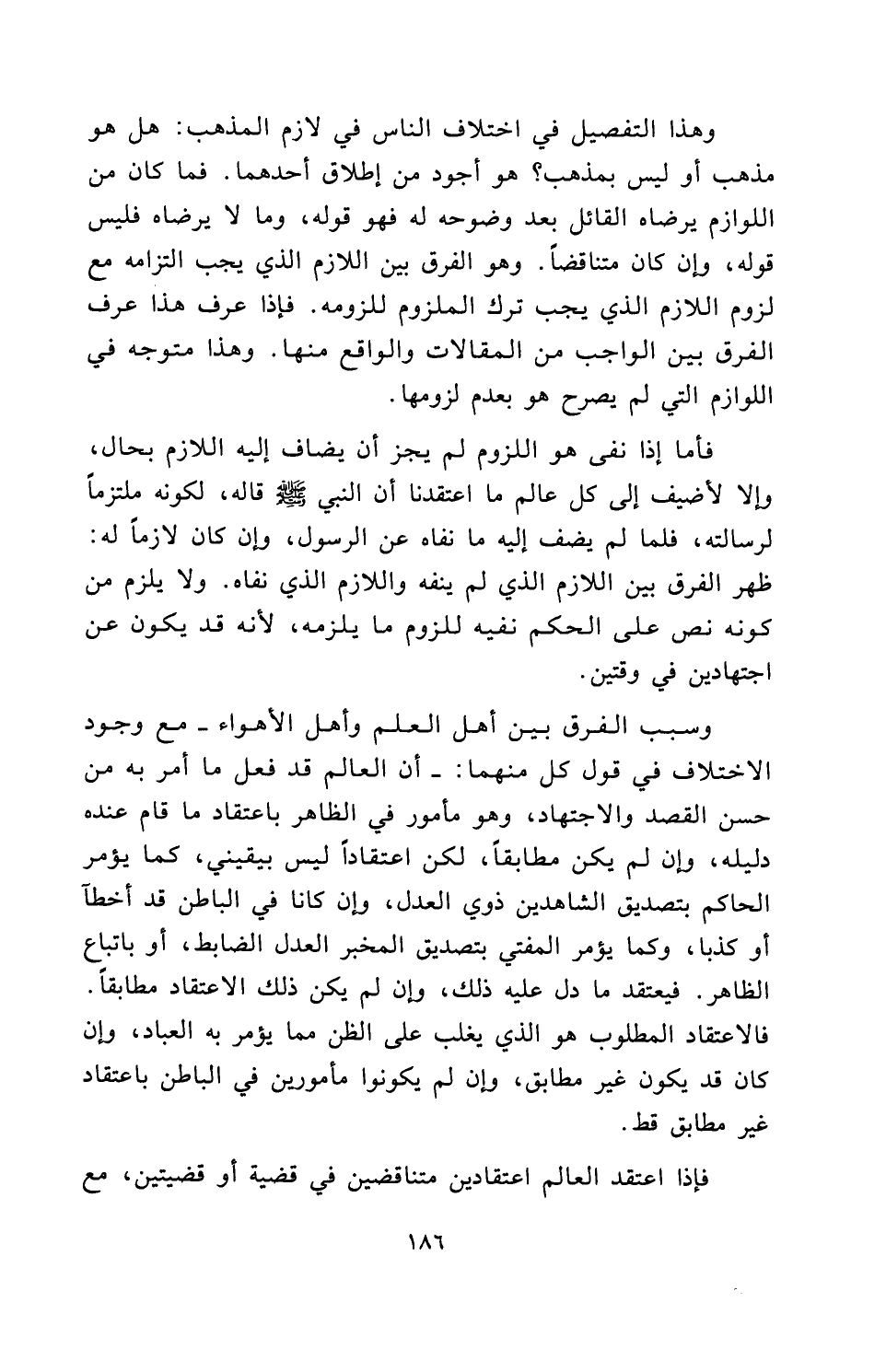 وَهَذَا التَّفْصِيلُ فِي اخْتِلَافِ النَّاسِ فِي لَازِمِ الْمَذْهَبِ: هَلْ هُوَ مَذْهَبٌ أَوْ لَيْسَ بِمَذْهَبٍ؟ هُوَ أَجْوَدُ مِنْ إِطْلَاقِ أَحَدِهِمَا، فَمَا كَانَ مِنَ اللَّوَازِمِ يَرْضَاهُ الْقَائِلُ بَعْدَ وُضُوحِهِ لَهُ فَهُوَ قَوْلُهُ، وَمَا لَا يَرْضَاهُ فَلَيْسَ قَوْلَهُ، وَإِنْ كَانَ مُتَنَاقِضًا، وَهُوَ الْفَرْقُ بَيْنَ اللَّازِمِ الَّذِي يَجِبُ الْتِزَامُهُ مَعَ لُزُومِ اللَّازِمِ الَّذِي يَجِبُ تَرْكُ الْمَلْزُومِ لِلُزُومِهِ، فَإِذَا عَرَفَ هَذَا عَرَفَ الْفَرْقَ بَيْنَ الْوَاجِبِ مِنَ الْمَقَالَاتِ وَالْوَاقِعِ مِنْهَا، وَهَذَا مُتَوَجِّهٌ فِي اللَّوَازِمِ الَّتِي لَمْ يُصَرِّحْ هُوَ بِعَدَمِ لُزُومِهَا.