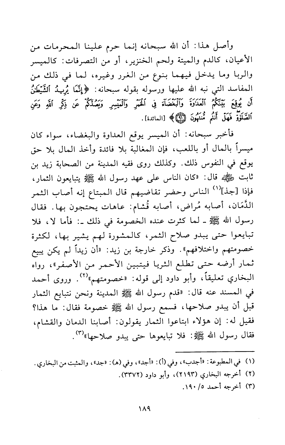 فَأَخْبَرَ سُبْحَانَهُ: أَنَّ الْمَيْسِرَ يُوقِعُ الْعَدَاوَةَ وَالْبَغْضَاءَ، سَوَاءٌ كَانَ مَيْسِرًا بِالْمَالِ أَوْ بِاللَّعِبِ، فَإِنَّ الْمُغَالَبَةَ بِلَا فَائِدَةٍ وَأَخْذَ الْمَالِ بِلَا حَقٍّ يُوقِعُ فِي النُّفُوسِ ذَلِكَ، وَكَذَلِكَ رَوَى فَقِيهُ الْمَدِينَةِ مِنَ الصَّحَابَةِ زَيْدُ بْنُ ثَابِتٍ - رَضِيَ اللَّهُ عَنْهُ - قَالَ: كَانَ النَّاسُ عَلَى عَهْدِ رَسُولِ اللَّهِ - صَلَّى اللَّهُ عَلَيْهِ وَسَلَّمَ - يَتَبَايَعُونَ الثِّمَارَ، فَإِذَا [جَذَّ] النَّاسُ وَحَضَرَ تَقَاضِيهِمْ قَالَ الْمُبْتَاعُ إِنَّهُ أَصَابَ الثَّمَرَ الدَّمَانَ، أَصَابَهُ مُرَاضٌ، أَصَابَهُ قُشَامٌ: عَاهَاتٌ يَحْتَجُّونَ بِهَا، فَقَالَ رَسُولُ اللَّهِ صَلَّى اللَّهُ عَلَيْهِ وَسَلَّمَ - لَمَّا كَثُرَتْ عِنْدَهُ الْخُصُومَةُ فِي ذَلِكَ -: «فَأَمَّا لَا، فَلَا تَبَايَعُوا حَتَّى يَبْدُوَ صَلَاحُ الثَّمَرِ، كَالْمَشُورَةِ لَهُمْ يُشِيرُ بِهَا، لِكَثْرَةِ خُصُومَتِهِمْ وَاخْتِلَافِهِمْ» وَذَكَرَ خَارِجَةُ بْنُ زَيْدٍ: " أَنَّ زيدا لَمْ يَكُنْ يَبِيعُ ثِمَارَ أَرْضِهِ حَتَّى تَطْلُعَ الثُّرَيَّا فَيَتَبَيَّنَ الْأَحْمَرُ مِنَ الْأَصْفَرِ " رَوَاهُ الْبُخَارِيُّ تَعْلِيقًا، وأبو داود إِلَى قَوْلِهِ: " خُصُومَتِهِمْ "، وَرَوَى أحمد فِي الْمُسْنَدِ عَنْهُ قَالَ: «قَدِمَ رَسُولُ اللَّهِ - صَلَّى اللَّهُ عَلَيْهِ وَسَلَّمَ - الْمَدِينَةَ وَنَحْنُ نَتَبَايَعُ الثِّمَارَ قَبْلَ أَنْ يَبْدُوَ صَلَاحُهَا، فَسَمِعَ رَسُولُ اللَّهِ - صَلَّى اللَّهُ عَلَيْهِ وَسَلَّمَ - خُصُومَةً فَقَالَ: مَا هَذَا؟ فَقِيلَ لَهُ: إِنَّ هَؤُلَاءِ ابْتَاعُوا الثِّمَارَ يَقُولُونَ: أَصَابَنَا الدَّمَانُ وَالْقُشَامُ، فَقَالَ رَسُولُ اللَّهِ - صَلَّى اللَّهُ عَلَيْهِ وَسَلَّمَ -: فَلَا تَبَايَعُوهَا حَتَّى يَبْدُوَ صَلَاحُهَا» .