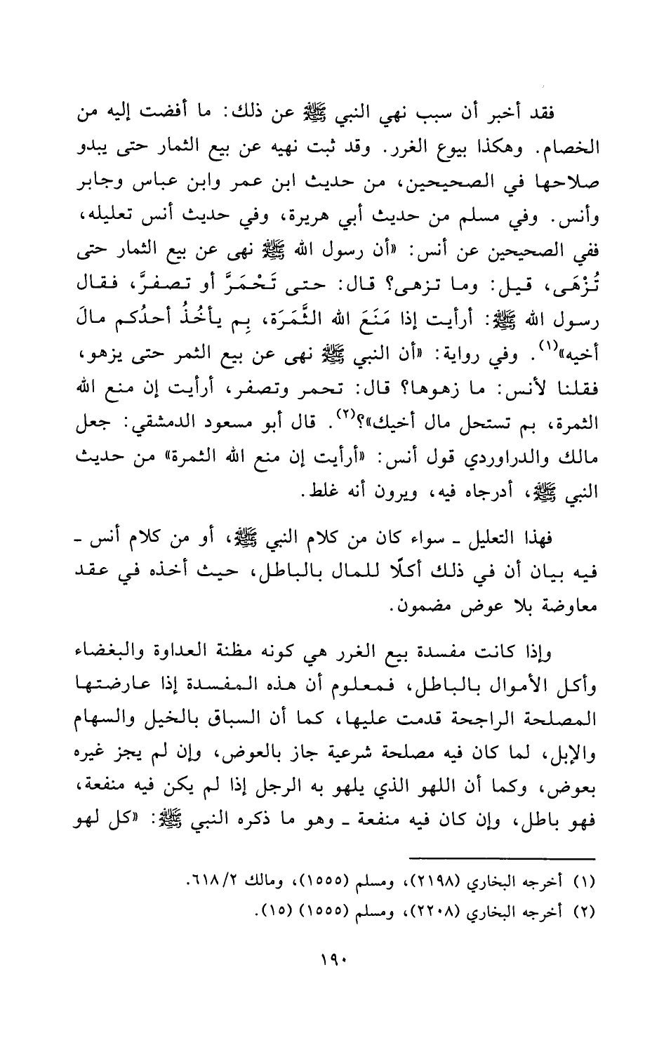 فَقَدْ أَخْبَرَ أَنَّ سَبَبَ نَهْيِ النَّبِيِّ - صَلَّى اللَّهُ عَلَيْهِ وَسَلَّمَ - عَنْ ذَلِكَ: مَا أَفْضَتْ إِلَيْهِ مِنَ الْخِصَامِ، وَهَكَذَا بُيُوعُ الْغَرَرِ، وَقَدْ ثَبَتَ نَهْيُهُ عَنْ بَيْعِ الثِّمَارِ حَتَّى يَبْدُوَ صَلَاحُهَا فِي الصَّحِيحَيْنِ، مِنْ حَدِيثِ ابْنِ عُمَرَ، وَابْنِ عَبَّاسٍ، وجابر، وأنس. وَفِي مسلم مِنْ حَدِيثِ أَبِي هُرَيْرَةَ، وَفِي حَدِيثِ أنس تَعْلِيلُهُ، فَفِي الصَّحِيحَيْنِ عَنْ أنس: «أَنَّ رَسُولَ اللَّهِ - صَلَّى اللَّهُ عَلَيْهِ وَسَلَّمَ - نَهَى عَنْ بَيْعِ الثِّمَارِ حَتَّى تُزْهَى، قِيلَ: وَمَا تُزْهَى؟ قَالَ: حَتَّى تَحْمَرَّ أَوْ تَصْفَرَّ، فَقَالَ رَسُولُ اللَّهِ - صَلَّى اللَّهُ عَلَيْهِ وَسَلَّمَ -: أَرَأَيْتَ إِذَا مَنَعَ اللَّهُ الثَّمَرَةَ، بِمَ يَأْخُذُ أَحَدُكُمْ مَالَ أَخِيهِ» وَفِي رِوَايَةٍ: «أَنَّ النَّبِيَّ - صَلَّى اللَّهُ عَلَيْهِ وَسَلَّمَ - نَهَى عَنْ بَيْعِ الثَّمَرِ حَتَّى يَزْهُوَ، فَقُلْنَا لِأَنَسٍ: مَا زَهْوُهَا؟ قَالَ: تَحْمَرُّ وَتَصْفَرُّ، أَرَأَيْتَ إِنْ مَنَعَ اللَّهُ الثَّمَرَةَ، بِمَ تَسْتَحِلُّ مَالَ أَخِيكَ» ، قَالَ أَبُو مَسْعُودٍ الدِّمَشْقِيُّ: جَعَلَ مالك والداروردي قَوْلَ أنس: أَرَأَيْتَ إِنْ مَنَعَ اللَّهُ الثَّمَرَةَ مِنْ حَدِيثِ النَّبِيِّ - صَلَّى اللَّهُ عَلَيْهِ وَسَلَّمَ -، أَدْرَجَاهُ فِيهِ، وَيَرَوْنَ أَنَّهُ غَلِطَ.