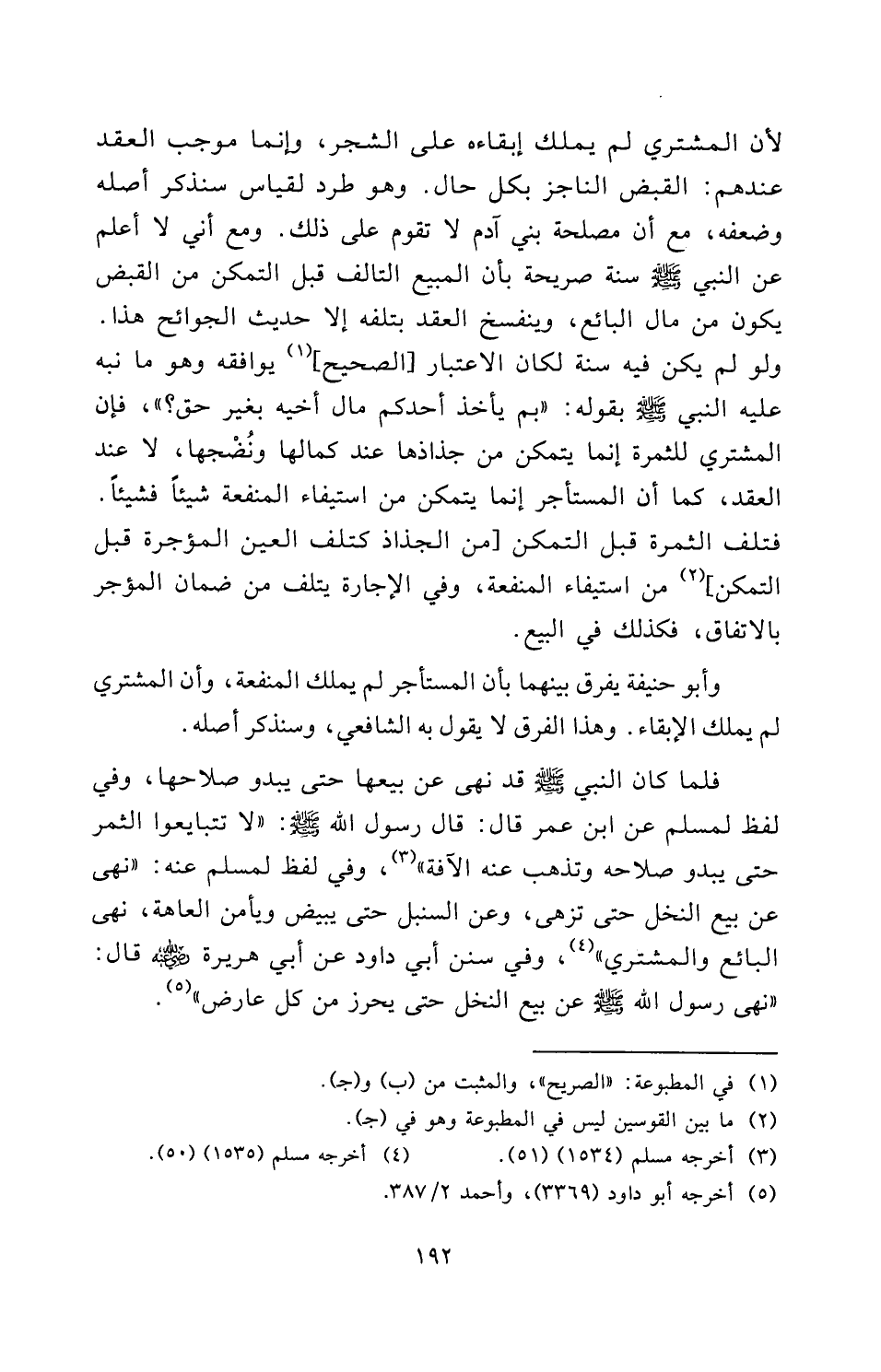 فَلَمَّا كَانَ النَّبِيُّ - صَلَّى اللَّهُ عَلَيْهِ وَسَلَّمَ - قَدْ نَهَى عَنْ بَيْعِهَا حَتَّى يَبْدُوَ صَلَاحُهَا، وَفِي لَفْظِ مسلم عَنِ ابْنِ عُمَرَ قَالَ: قَالَ رَسُولُ اللَّهِ - صَلَّى اللَّهُ عَلَيْهِ وَسَلَّمَ -: «لَا تَتَبَايَعُوا الثَّمَرَ حَتَّى يَبْدُوَ صَلَاحُهُ وَتَذْهَبَ عَنْهُ الْآفَةُ» ، وَفِي لَفْظٍ لمسلم عَنْهُ: «نَهَى عَنْ بَيْعِ النَّخْلِ حَتَّى تُزْهَى، وَعَنِ السُّنْبُلِ حَتَّى يَبْيَضَّ وَيَأْمَنَ الْعَاهَةَ، نَهَى الْبَائِعَ وَالْمُشْتَرِيَ» وَفِي سُنَنِ أبي داود عَنْ أَبِي هُرَيْرَةَ - رَضِيَ اللَّهُ عَنْهُ - قَالَ: «نَهَى رَسُولُ اللَّهِ - صَلَّى اللَّهُ عَلَيْهِ وَسَلَّمَ - عَنْ بَيْعِ النَّخْلِ حَتَّى يُحْرَزَ مِنْ كُلِّ عَارِضٍ» .