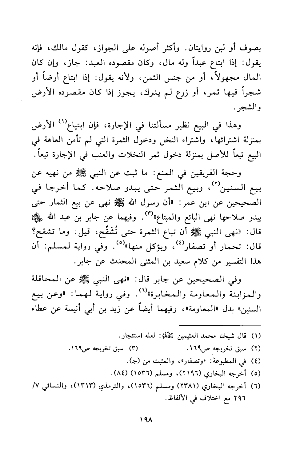 وَفِي الصَّحِيحَيْنِ عَنْ جابر قَالَ: " «نَهَى النَّبِيُّ - صَلَّى اللَّهُ عَلَيْهِ وَسَلَّمَ - عَنِ الْمُحَاقَلَةِ وَالْمُزَابَنَةِ وَالْمُعَاوَمَةِ وَالْمُخَابَرَةِ» "، وَفِي رِوَايَةِ لَهُمَا " «وَعَنْ بَيْعِ السِّنِينَ» " بَدَلَ " الْمُعَاوَمَةِ "، وَفِيهِمَا أَيْضًا عَنْ زَيْدِ بْنِ أَبِي أُنَيْسَةَ عَنْ عطاء