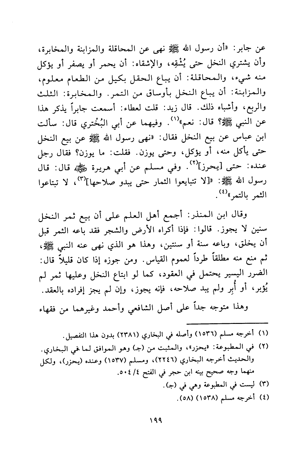 عَنْ جابر: «أَنَّ رَسُولَ اللَّهِ - صَلَّى اللَّهُ عَلَيْهِ وَسَلَّمَ " نَهَى عَنِ الْمُحَاقَلَةِ وَالْمُزَابَنَةِ وَالْمُخَابَرَةِ، وَأَنْ يَشْتَرِيَ النَّخْلَ حَتَّى يُشْقِهَ، وَالْإِشْقَاهُ: أَنْ يَحْمَرَّ أَوْ يَصْفَرَّ أَوْ يُؤْكَلَ مِنْهُ شَيْءٌ، وَالْمُحَاقَلَةُ: أَنْ يُبَاعَ الْحَقْلُ بِكَيْلٍ مِنَ الطَّعَامِ مَعْلُومٍ، وَالْمُزَابَنَةُ: أَنْ يُبَاعَ النَّخْلُ بِأَوْسَاقٍ مِنَ التَّمْرِ. وَالْمُخَابَرَةُ: الثُّلُثُ وَالرُّبْعُ، وَأَشْبَاهُ ذَلِكَ» . قَالَ زيد: قُلْتُ لعطاء: أَسَمِعْتَ جابرا يَذْكُرُ هَذَا عَنِ النَّبِيِّ - صَلَّى اللَّهُ عَلَيْهِ وَسَلَّمَ - قَالَ: نَعَمْ، وَفِيهِمَا عَنْ أبي البختري قَالَ: سَأَلْتُ ابْنَ عَبَّاسٍ عَنْ بَيْعِ النَّخْلِ، فَقَالَ: " «نَهَى رَسُولُ اللَّهِ - صَلَّى اللَّهُ عَلَيْهِ وَسَلَّمَ - عَنْ بَيْعِ النَّخْلِ حَتَّى يَأْكُلَ مِنْهُ، أَوْ يُؤْكَلَ، وَحَتَّى يُوزَنَ. فَقُلْتُ: مَا يُوزَنُ؟ فَقَالَ رَجُلٌ عِنْدَهُ: حَتَّى [يُحْرَزَ] » "، وَفِي مسلم عَنْ أَبِي هُرَيْرَةَ - رَضِيَ اللَّهُ عَنْهُ - قَالَ: قَالَ رَسُولُ اللَّهِ - صَلَّى اللَّهُ عَلَيْهِ وَسَلَّمَ -: " « [لَا تَبْتَاعُوا الثِّمَارَ حَتَّى يَبْدُوَ صَلَاحُهَا] ، لَا تَبْتَاعُوا الثَّمَرَ بِالتَّمْرِ» ".