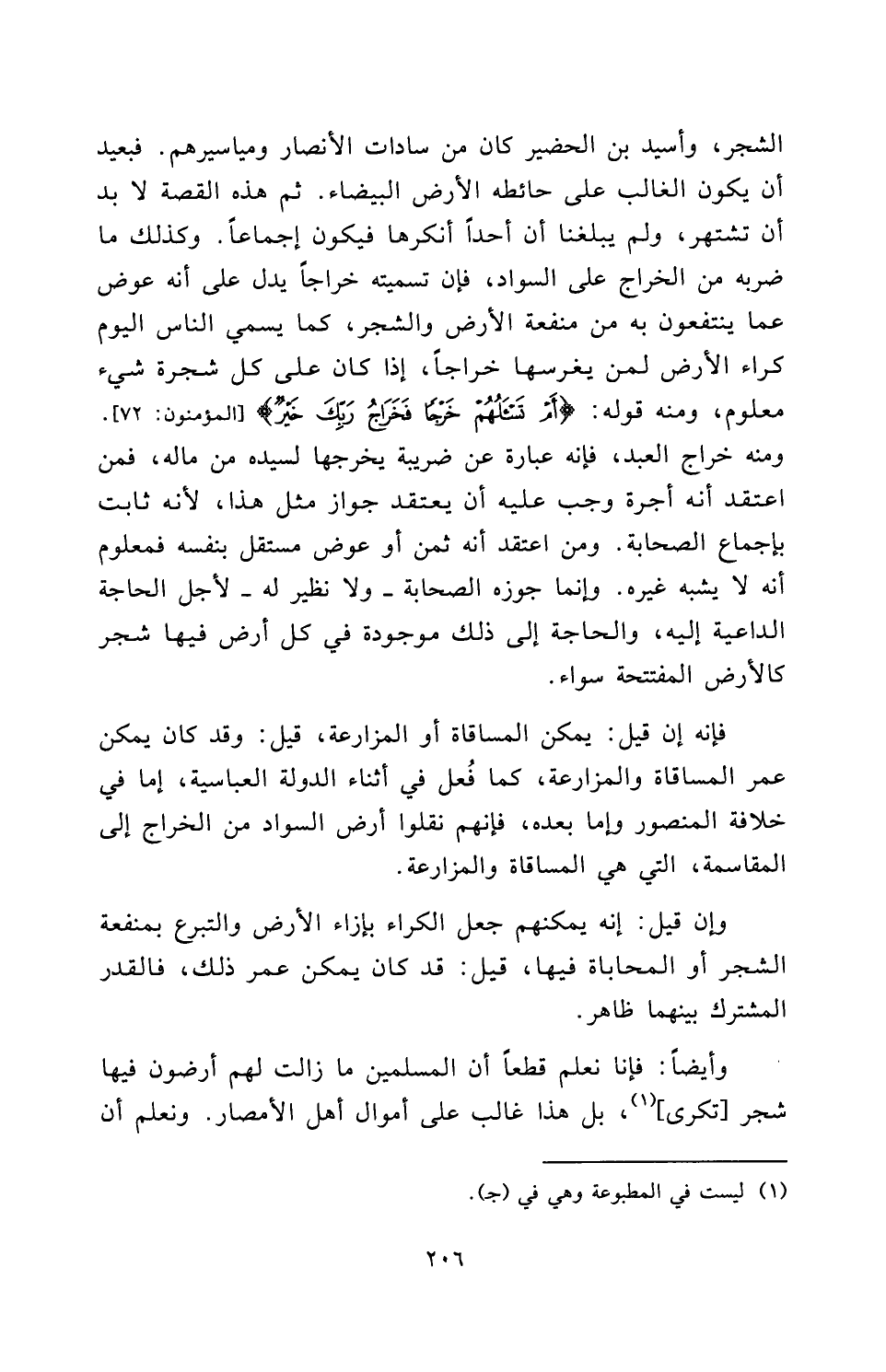الشَّجَرَ، وَأُسَيْدُ بْنُ الْحُضَيْرِ كَانَ مِنْ سَادَاتِ الْأَنْصَارِ وَمَيَاسِيرِهِمْ، فَبَعِيدٌ أَنْ يَكُونَ الْغَالِبُ عَلَى حَائِطِهِ الْأَرْضَ الْبَيْضَاءَ، ثُمَّ هَذِهِ الْقِصَّةُ لَا بُدَّ أَنْ تَشْتَهِرَ، وَلَمْ يَبْلُغْنَا أَنَّ أَحَدًا أَنْكَرَهَا فَيَكُونُ إِجْمَاعًا، وَكَذَلِكَ مَا ضَرَبَهُ مِنَ الْخَرَاجِ عَلَى السَّوَادِ، فَإِنَّ تَسْمِيَتَهُ خَرَاجًا يَدُلُّ عَلَى أَنَّهُ عِوَضٌ عَمَّا يَنْتَفِعُونَ بِهِ مِنْ مَنْفَعَةِ الْأَرْضِ وَالشَّجَرِ، كَمَا يُسَمِّي النَّاسُ الْيَوْمَ كِرَاءَ الْأَرْضِ لِمَنْ يَغْرِسُهَا خَرَاجًا، إِذَا كَانَ عَلَى كُلِّ شَجَرَةٍ شَيْءٌ مَعْلُومٌ، وَمِنْهُ قَوْلُهُ: {أَمْ تَسْأَلُهُمْ خَرْجًا فَخَرَاجُ رَبِّكَ خَيْرٌ} [المؤمنون: 72] [الْمُؤْمِنُونَ: 72] وَمِنْهُ خَرَاجُ الْعَبْدِ، فَإِنَّهُ عِبَارَةٌ عَنْ ضَرِيبَةٍ يُخْرِجُهَا لِسَيِّدِهِ مِنْ مَالِهِ، فَمَنِ اعْتَقَدَ أَنَّهُ أُجْرَةٌ وَجَبَ عَلَيْهِ أَنْ يَعْتَقِدَ جَوَازَ مِثْلِ هَذَا، لِأَنَّهُ ثَابِتٌ بِإِجْمَاعِ الصَّحَابَةِ. وَمَنِ اعْتَقَدَ أَنَّهُ ثَمَنٌ أَوْ عِوَضٌ مُسْتَقِلٌّ بِنَفْسِهِ فَمَعْلُومٌ أَنَّهُ لَا يُشْبِهُ غَيْرَهُ، وَإِنَّمَا جَوَّزَهُ الصَّحَابَةُ - وَلَا نَظِيرَ لَهُ - لِأَجْلِ الْحَاجَةِ الدَّاعِيَةِ إِلَيْهِ، وَالْحَاجَةُ إِلَى ذَلِكَ مَوْجُودَةٌ فِي كُلِّ أَرْضٍ فِيهَا شَجَرٌ كَالْأَرْضِ الْمُفْتَتَحَةِ سَوَاءٌ.