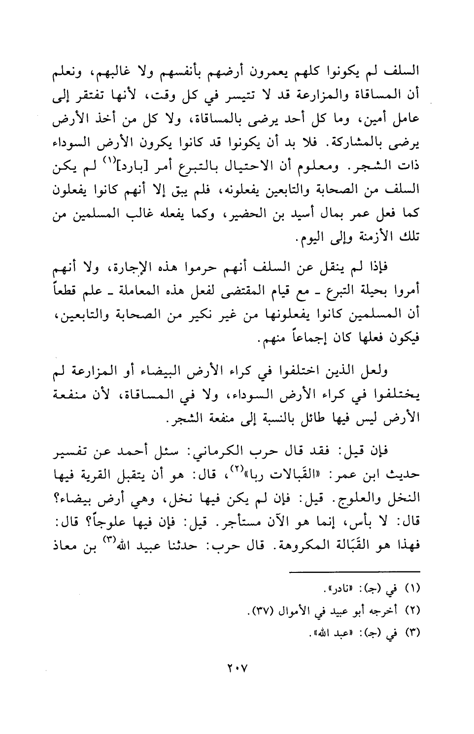 السَّلَفَ لَمْ يَكُونُوا كُلُّهُمْ يَعْمُرُونَ أَرْضَهُمْ بِأَنْفُسِهِمْ وَلَا غَالِبُهُمْ، وَنَعْلَمُ أَنَّ الْمُسَاقَاةَ وَالْمُزَارَعَةَ لَا تَتَيَسَّرُ فِي كُلِّ وَقْتٍ ; لِأَنَّهَا تَفْتَقِرُ إِلَى عَامِلٍ أَمِينٍ، وَمَا كُلُّ أَحَدٍ يَرْضَى بِالْمُسَاقَاةِ، وَلَا كُلُّ مَنْ أَخَذَ الْأَرْضَ يَرْضَى بِالْمُشَارَكَةِ، فَلَا بُدَّ أَنْ يَكُونُوا قَدْ كَانُوا يُكْرُونَ الْأَرْضَ السَّوْدَاءَ ذَاتَ الشَّجَرِ، وَمَعْلُومٌ أَنَّ الِاحْتِيَالَ بِالتَّبَرُّعِ أَمْرٌ [بَارِدٌ] لَمْ يَكُنِ السَّلَفُ مِنَ الصَّحَابَةِ وَالتَّابِعِينَ يَفْعَلُونَهُ، فَلَمْ يَبْقَ إِلَّا أَنَّهُمْ كَانُوا يَفْعَلُونَ كَمَا فَعَلَ عمر بِمَالِ أُسَيْدِ بْنِ الْحُضَيْرِ، وَكَمَا يَفْعَلُهُ غَالِبُ الْمُسْلِمِينَ مِنْ تِلْكَ الْأَزْمِنَةِ وَإِلَى الْيَوْمِ.
