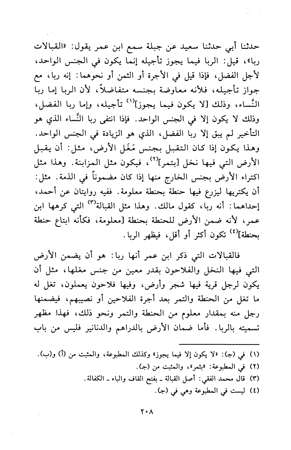 فَالْقَبَالَاتُ الَّتِي ذَكَرَ ابْنُ عُمَرَ أَنَّهَا رِبًا: هُوَ أَنْ يَضْمَنَ الْأَرْضَ الَّتِي فِيهَا النَّخْلُ وَالْفَلَّاحُونَ مِنْ جِنْسِ مَغَلِهَا، مِثْلَ أَنْ يَكُونَ لِرَجُلٍ قَرْيَةٌ فِيهَا شَجَرٌ وَأَرْضٌ، وَفِيهَا فَلَّاحُونَ يَعْمَلُونَ، تَغُلُّ لَهُ مَا تَغُلُّ مِنَ الْحِنْطَةِ وَالتَّمْرِ بَعْدَ أُجْرَةِ الْفَلَّاحِينَ أَوْ نَصِيبِهِمْ، فَيَضْمَنُهَا رَجُلٌ مِنْهُ بِمِقْدَارٍ مَعْلُومٍ مِنَ الْحِنْطَةِ وَالتَّمْرِ وَنَحْوِ ذَلِكَ، فَهَذَا مَظْهَرُ تَسْمِيَتِهِ بِالرِّبَا، فَأَمَّا ضَمَانُ الْأَرْضِ بِالدَّرَاهِمِ وَالدَّنَانِيرِ فَلَيْسَ مِنْ بَابِ