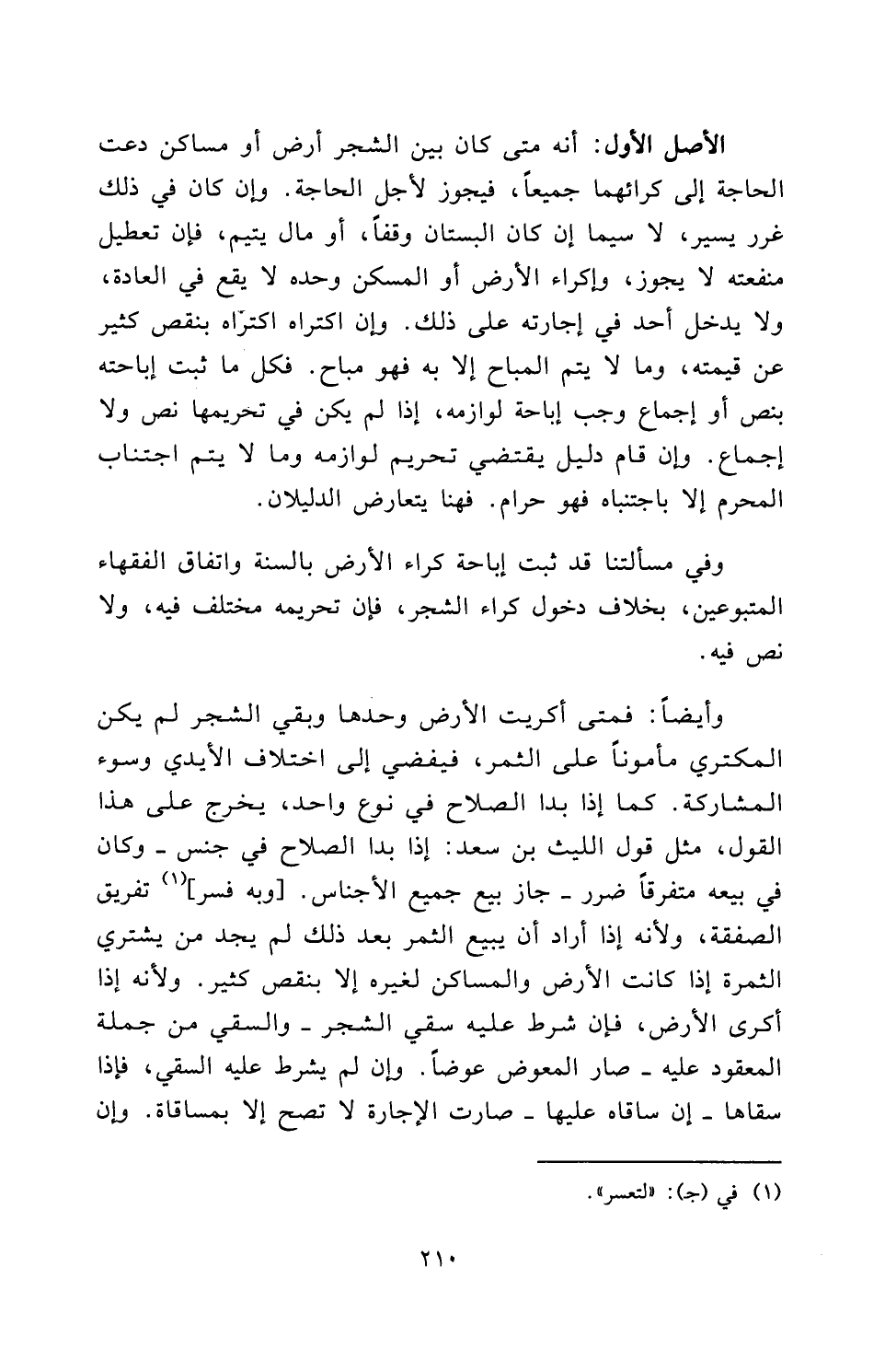 الْأَصْلُ الْأَوَّلُ: أَنَّهُ مَتَى كَانَ بَيْنَ الشَّجَرِ أَرْضٌ أَوْ مَسَاكِنُ دَعَتِ الْحَاجَةُ إِلَى كِرَائِهِمَا جَمِيعًا، فَيَجُوزُ لِأَجْلِ الْحَاجَةِ، وَإِنْ كَانَ فِي ذَلِكَ غَرَرٌ يَسِيرٌ، لَا سِيَّمَا إِنْ كَانَ الْبُسْتَانُ وَقْفًا، أَوْ مَالَ يَتِيمٍ، فَإِنَّ تَعْطِيلَ مَنْفَعَتِهِ لَا يَجُوزُ، وَإِكْرَاءُ الْأَرْضِ أَوِ الْمَسْكَنِ وَحْدَهُ لَا يَقَعُ فِي الْعَادَةِ، وَلَا يَدْخُلُ أَحَدٌ فِي إِجَارَتِهِ عَلَى ذَلِكَ، وَإِنِ اكْتَرَاهُ اكْتَرَاهُ بِنَقْصٍ كَثِيرٍ عَنْ قِيمَتِهِ، وَمَا لَا يَتِمُّ الْمُبَاحُ إِلَّا بِهِ فَهُوَ مُبَاحٌ، فَكُلُّ مَا ثَبَتَ إِبَاحَتُهُ بِنَصٍّ أَوْ إِجْمَاعٍ وَجَبَ إِبَاحَةُ لَوَازِمِهِ، إِذَا لَمْ يَكُنْ فِي تَحْرِيمِهَا نَصٌّ وَلَا إِجْمَاعٌ، وَإِنْ قَامَ دَلِيلٌ يَقْتَضِي تَحْرِيمَ لَوَازِمِهِ، وَمَا لَا يَتِمُّ اجْتِنَابُ الْمُحَرَّمِ إِلَّا بِاجْتِنَابِهِ فَهُوَ حَرَامٌ، فَهُنَا يَتَعَارَضُ الدَّلِيلَانِ.